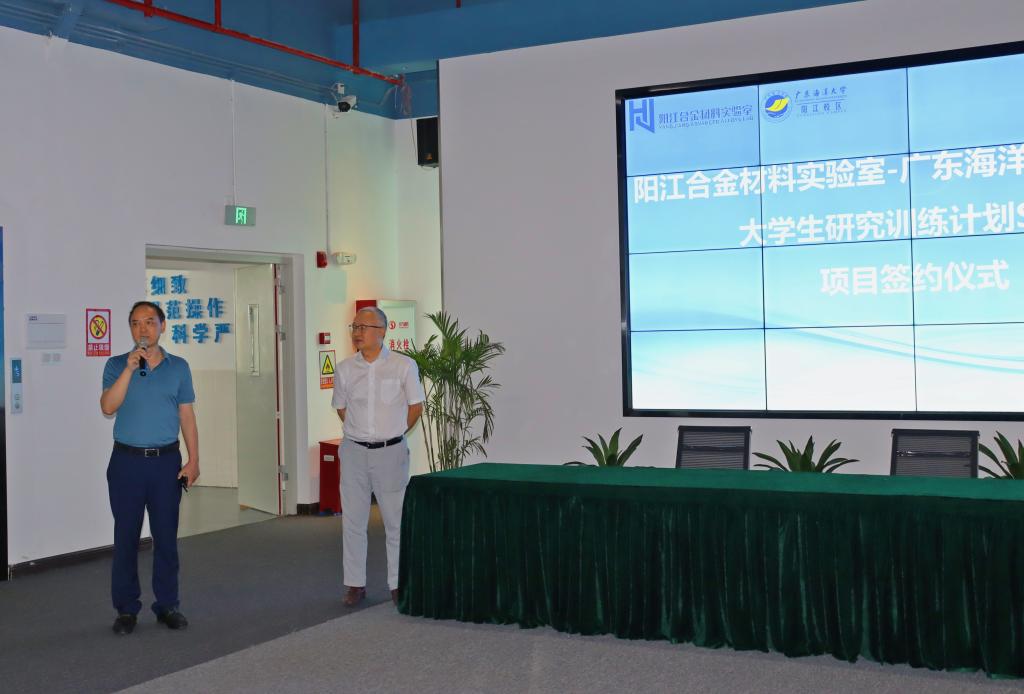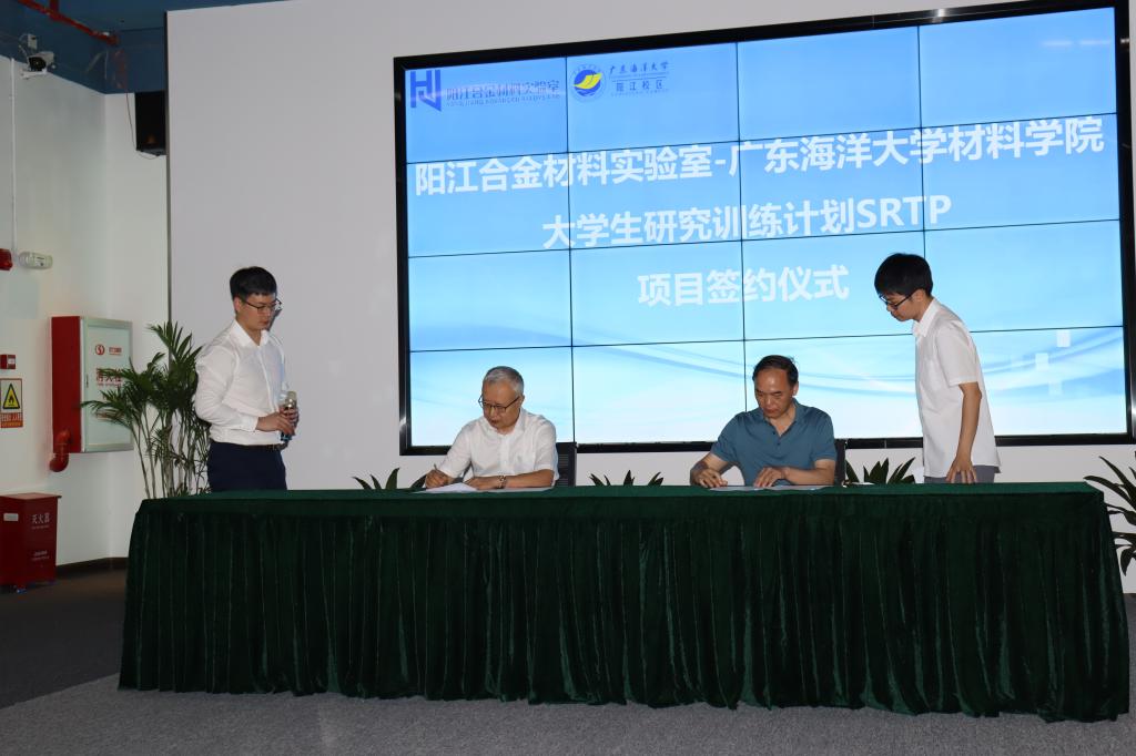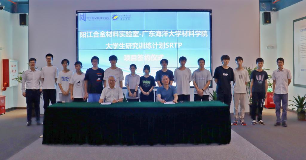 5月25日下午,阳江合金材料实验室-广东海洋大学材料学院“学生研究训练计划”(SRTP)签约仪式在阳江合金材料实验室举行。阳江合金材料实验室主任尚成嘉教授和广东海洋大学材料学院院长车晓舟教授代表合作双方签署了项目计划书。2022年度开展2项SRTP项目,共14名学生参加,由郭福建博士、袁胜福博士和李伟章老师担任指导教师。材料学院全体师生见证了项目计划书的签订。