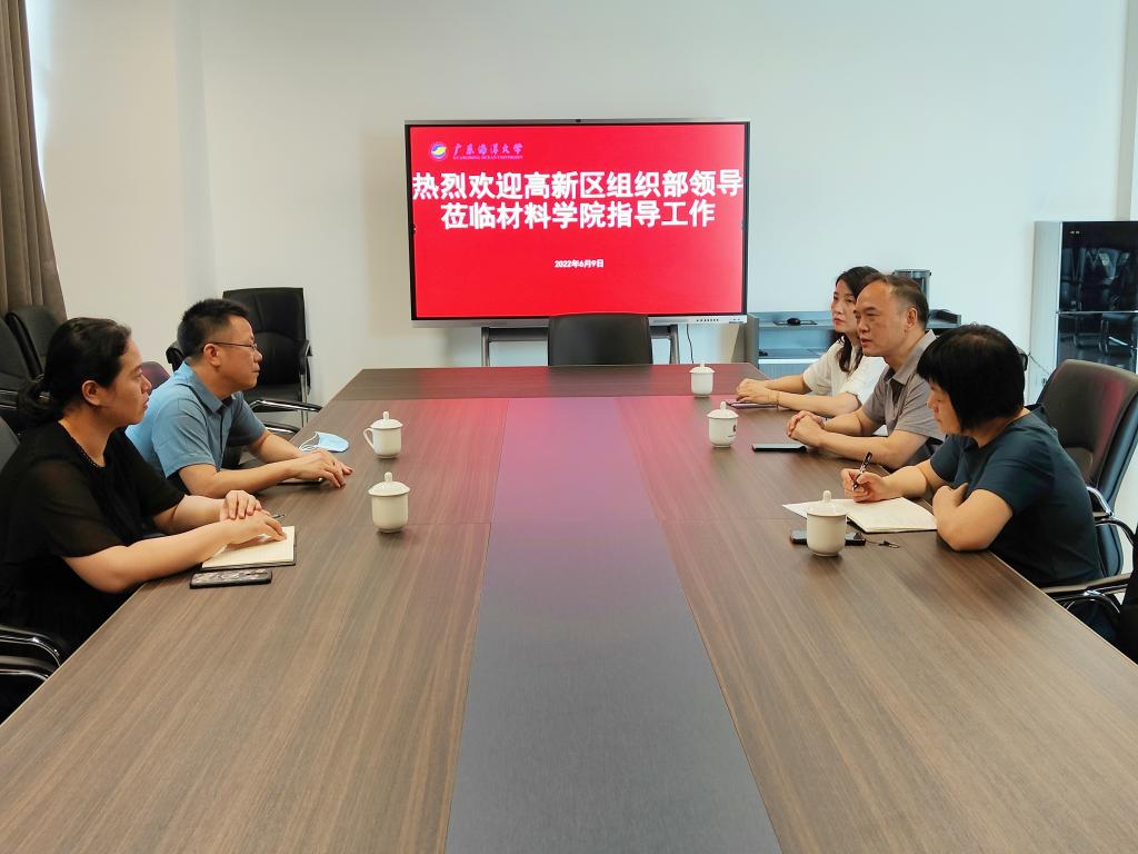 2022年6月9日,阳江市高新技术开发区组织部郑敢记副部长和人才室主任吴瑞婷到广东海洋大学阳江校区材料学院调研。高新区组织部领导和材料学院就人才培养、校企合作、学生就业等问题进行了深入探讨,并就合作模式、具体工作安排达成了共识。