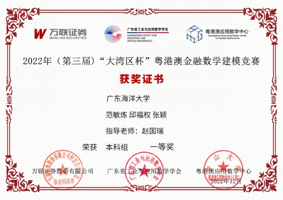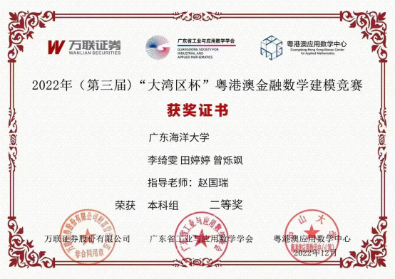近日,2022年第三届“大湾区杯”粤港澳金融数学建模竞赛获奖名单公示,广东海洋大学材料科学与工程学院在本次比赛中成绩突出,其中,来自材控4211班的张颖同学和材控4212班的田婷婷同学分别取得了本科组一等奖和本科组二等奖的斐然成绩。