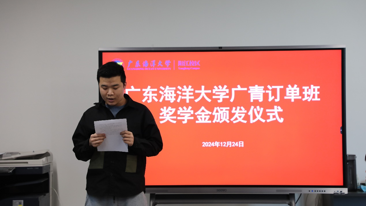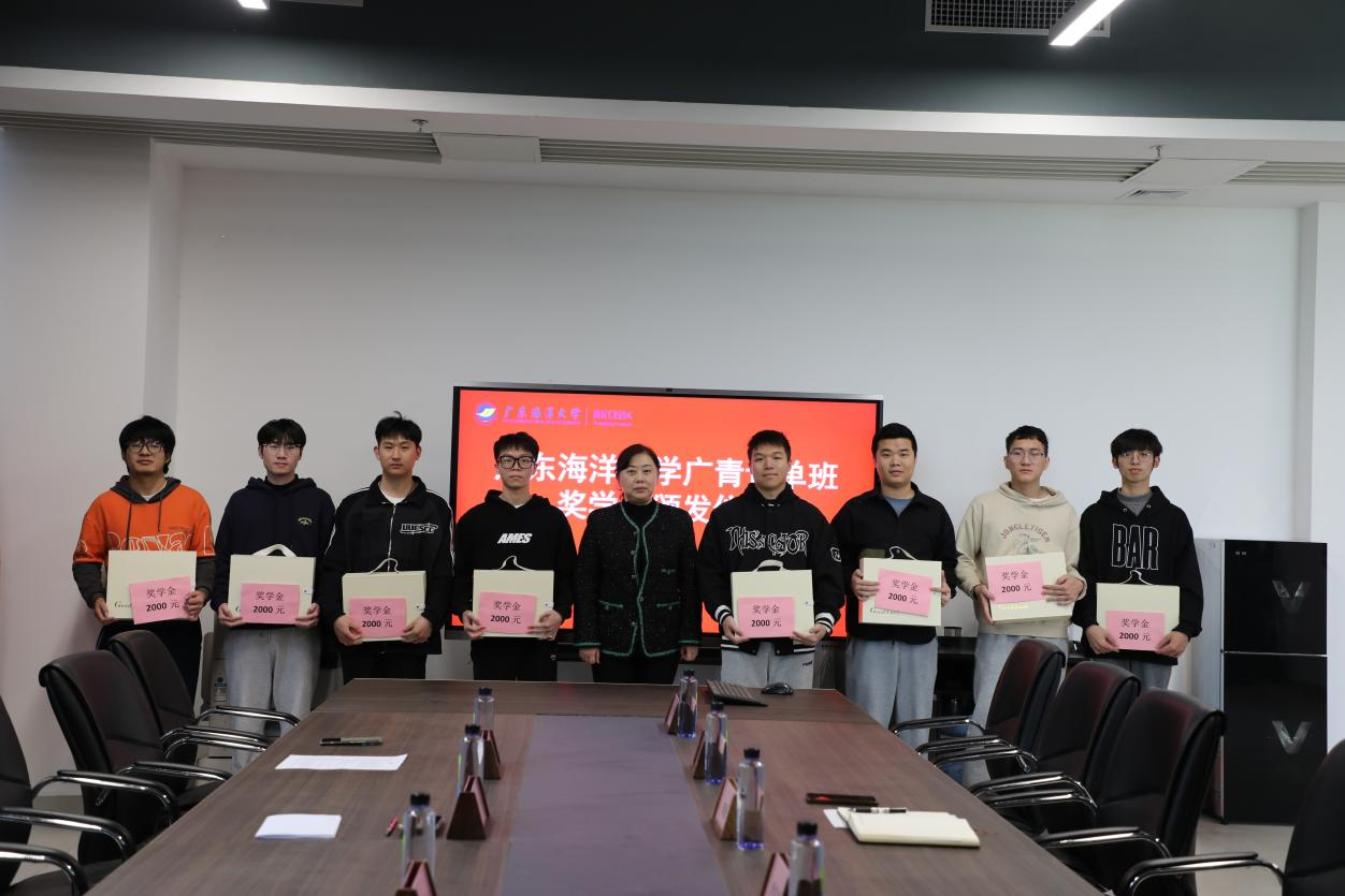 12月24日下午,广东海洋大学广青订单班奖学金颁发仪式在阳江校区厚为楼408会议室举行。广东广青金属科技有限公司党委副书记、工会主席王大庆出席仪式并颁奖。材料科学与工程学院党总支书记李毅、副院长尹冬松出席活动。
