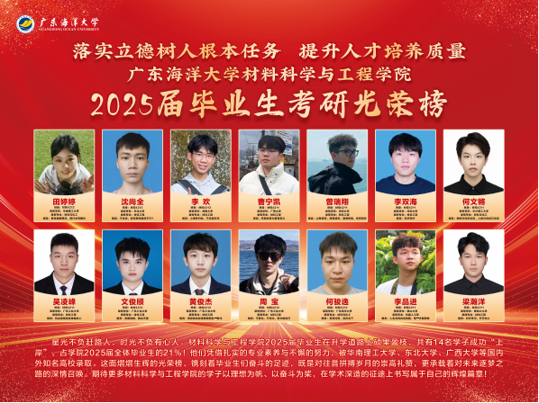 星光不负赶路人,时光不负有心人。广东海洋大学材料科学与工程学院2025届本科毕业生在升学道路上硕果盈枝,共有14名学子成功“上岸”,占学院2025届全体毕业生的21.5%!他们凭借扎实的专业素养与不懈的努力,被华南理工大学、东北大学、广西大学、深圳大学等国内外知名高校录取。这面熠熠生辉的光荣榜,镌刻着毕业生们奋斗的足迹,既是对往昔拼搏岁月的崇高礼赞,更承载着对未来逐梦之路的深情召唤。期待更多材料科学与工程学院的学子以理想为帆、以奋斗为桨,在学术深造的征途上书写属于自己的辉煌篇章!