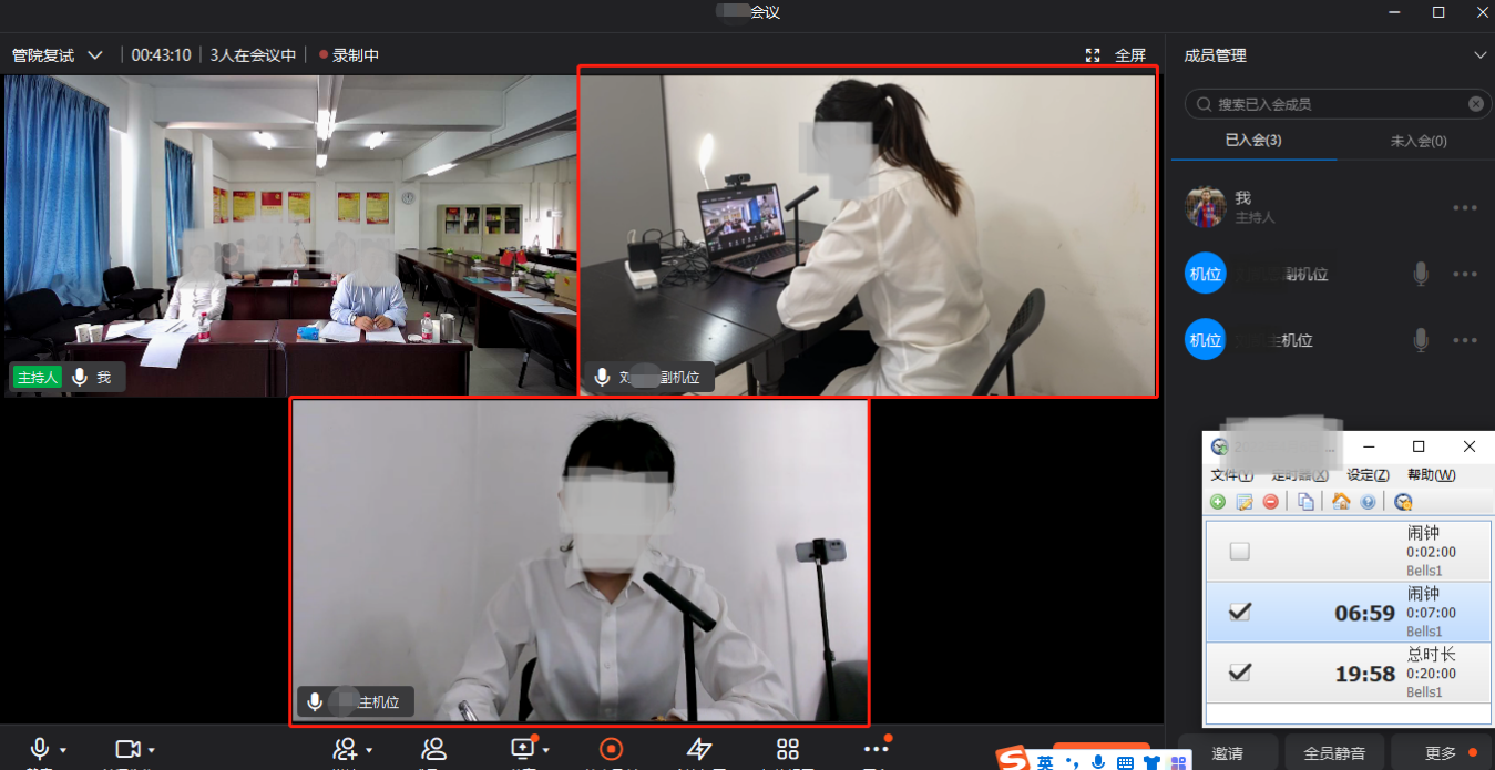 (1)复试形式。通过腾讯会议复试,复试前发给考生会议号。考试采用“双机位”方式。需准备具有摄像头的2个联网视频设备(1台电脑+1部手机或2部手机),请考生用两个设备分别登录腾讯会议,并确保设备电量充足。