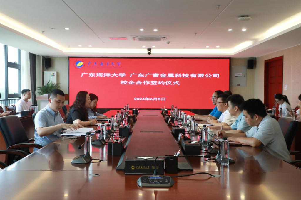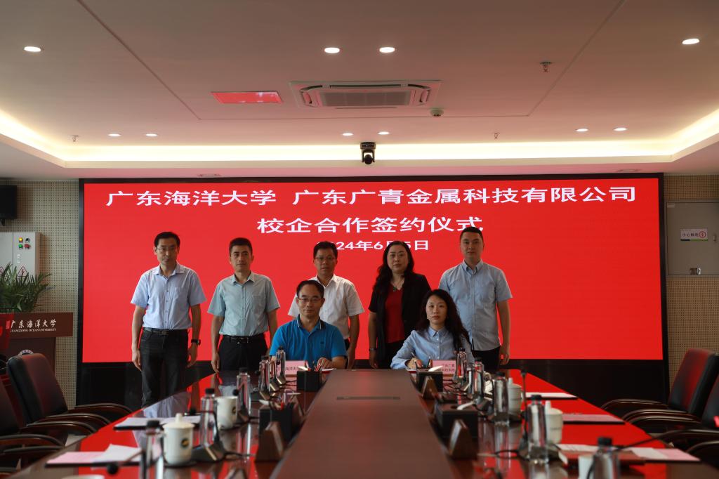 6月5日下午,广东海洋大学与广东广青金属科技有限公司在广东海洋大学阳江校区海纳楼712会议室举行校企合作签约仪式。校区党委副书记丁永成,材料科学与工程学院党总支书记李毅、院长师文庆、副院长尹冬松,广东广青金属科技有限公司党委副书记、工会主席王大庆,综合部副部长兼人力资源科科长张艺玲以及材料科学与工程学院首届签约订单班的16名学生共同出席签约仪式。此次合作标志着双方将共同推进产学研结合,携手开创“校企合作发展,深化人才培养”新模式。