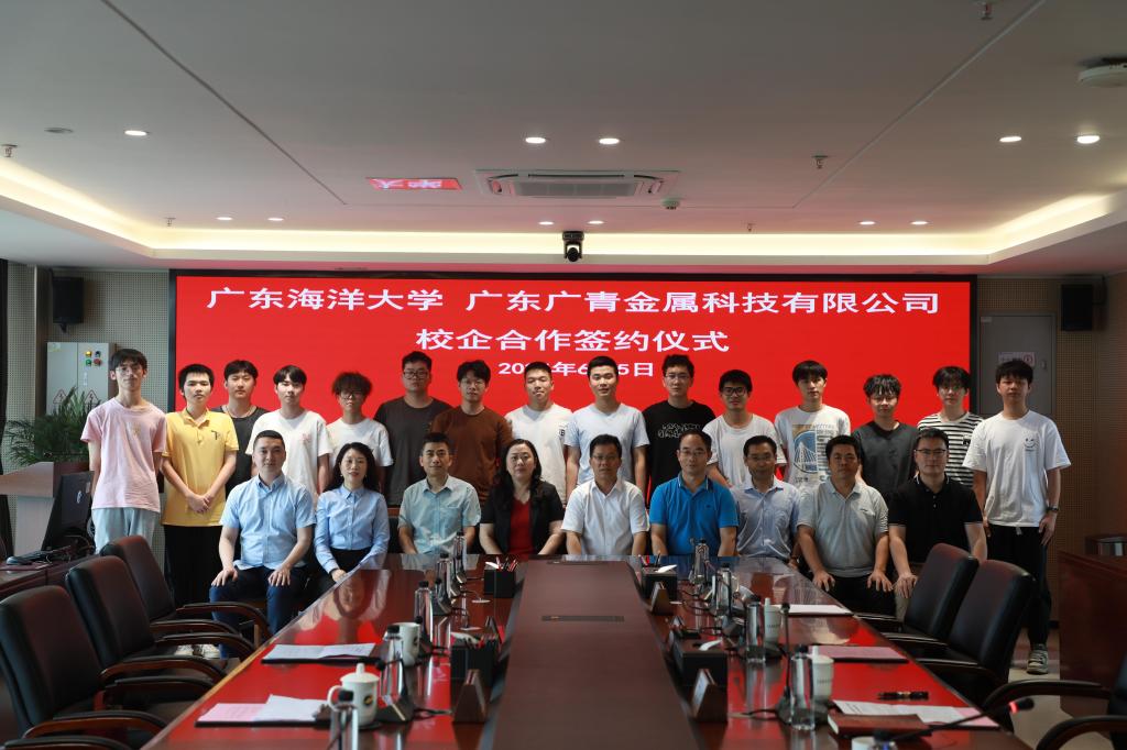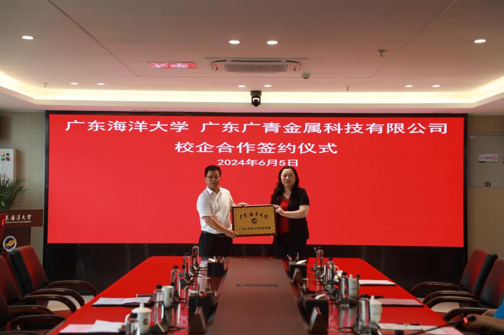 师文庆代表学校,张艺玲代表广东广青金属科技有限公司签署校企合作框架协议。丁永成向王大庆授予“广东海洋大学就业实习基地”以及“广东海洋大学广青订单班人才培养基地”牌匾。