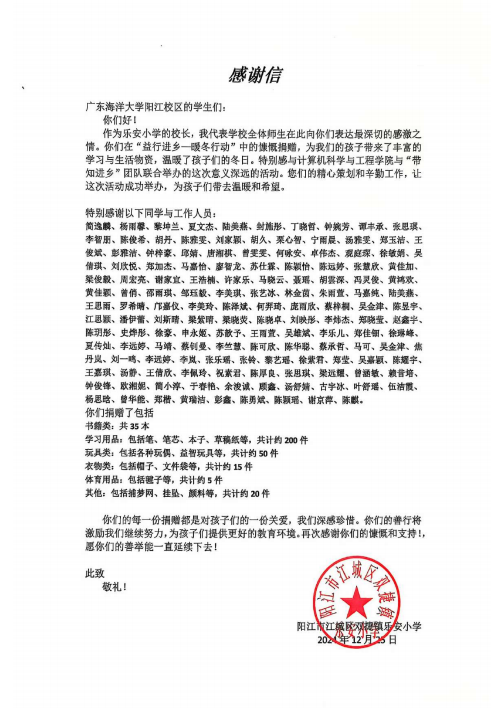 为响应乡村振兴之号召,传递关爱与温暖,百千万工程“带知进乡”团队携手计算机科学与工程学院文体部发起了面向阳江市乐安村乐安小学的爱心募捐活动,历时一个半月,该活动已于2024年12月25日圆满落幕。这场活动不仅凝聚了广东海洋大学阳江校区师生们的爱与善意,也为乐安小学的孩子们带去了温暖与希望。