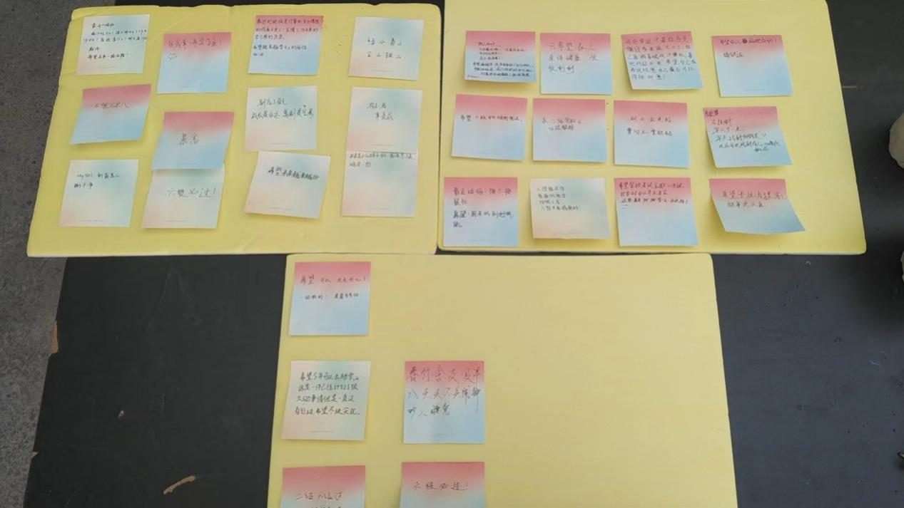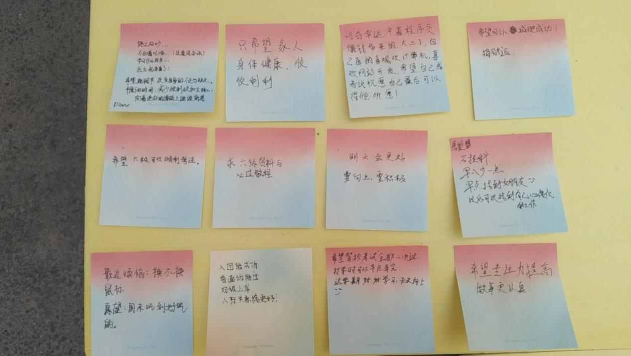 展板上贴满了同学们写下的纸条,有的同学在卡片上倾诉着学业上的压力,有的则分享着生活中的小困扰,还有不少同学写下了对未来的美好憧憬和对自己的鼓励打气的话语。这些卡片承载着同学们的真实情感,被一一贴在了活动现场的展板上,形成了一面充满温暖与力量的“心声墙”。相信在未来的大学生活里,这些绿植会陪伴着同学们一起,见证他们成长路上的点点滴滴。