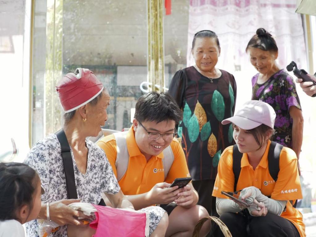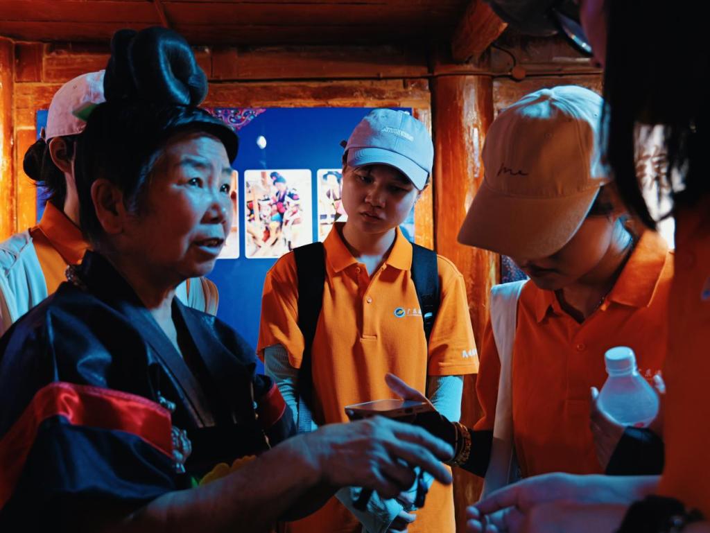 实践队首站来到舟溪镇曼洞村潘英绣馆,潘英(省级苗族织锦技艺传承人)向队员们展示手中的作品并介绍,苗绣不仅是技艺,更是“穿在身上的史书”,潘英表达“希望有文化的年轻人来学,把这些纹样写进书里、教进课堂,将非遗继续传承下去。”实践队转至曼洞镇集市,摆摊老奶奶指着摊位上的手工织品笑道:“这些不仅本地人买,外国的客人也会订,平时孩子们放假会来帮忙,只要有人买,这手艺就不能丢。”但她也坦言,本地年轻人更愿外出打工。