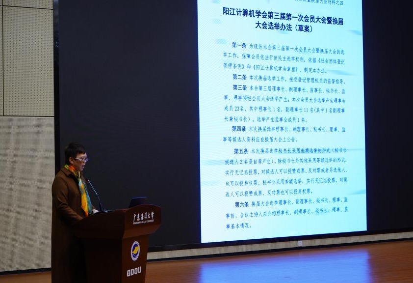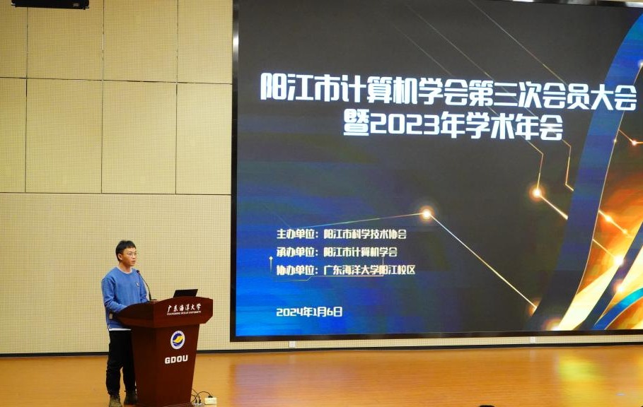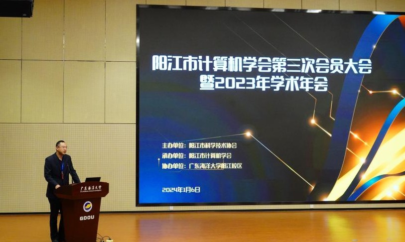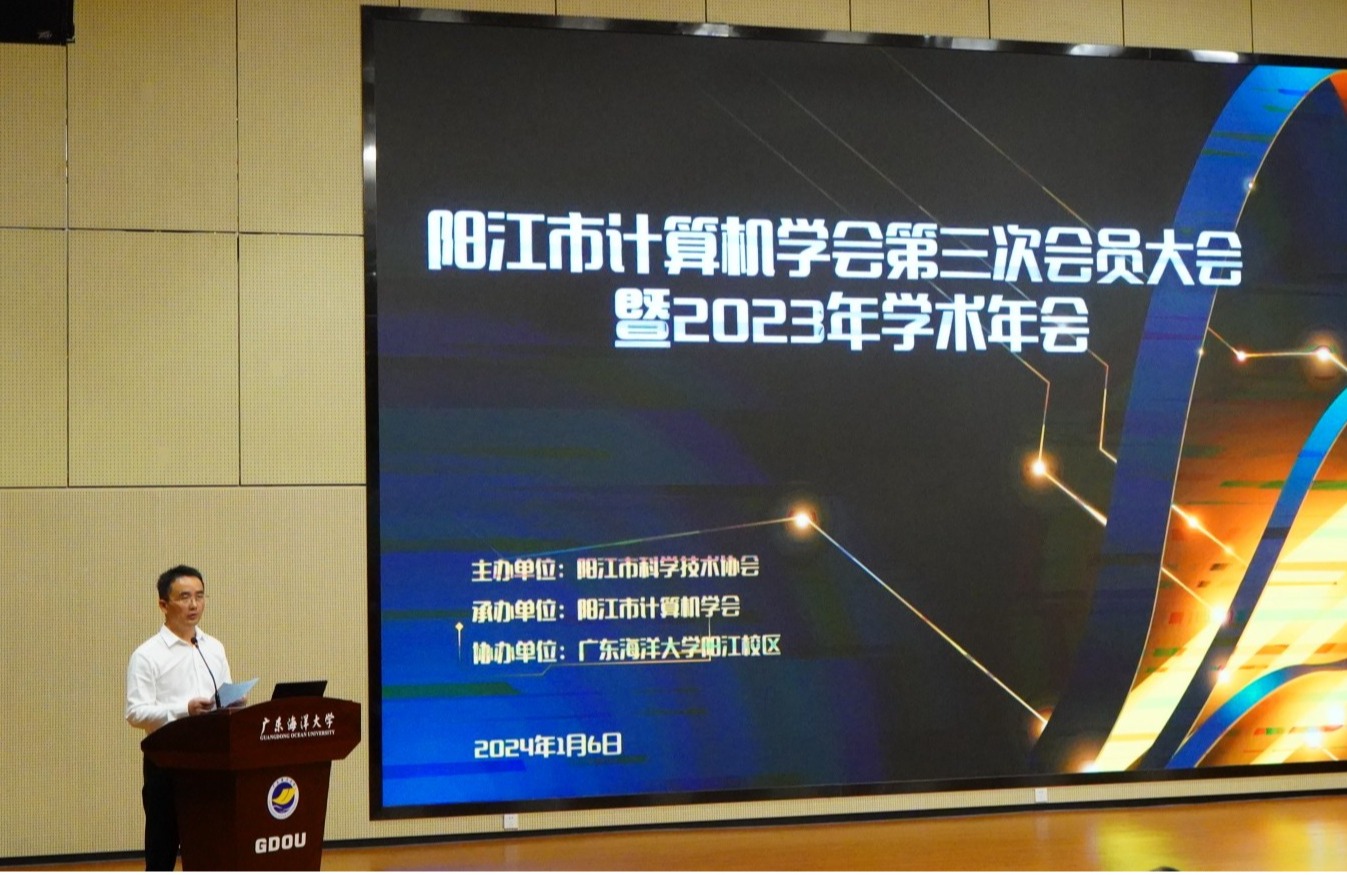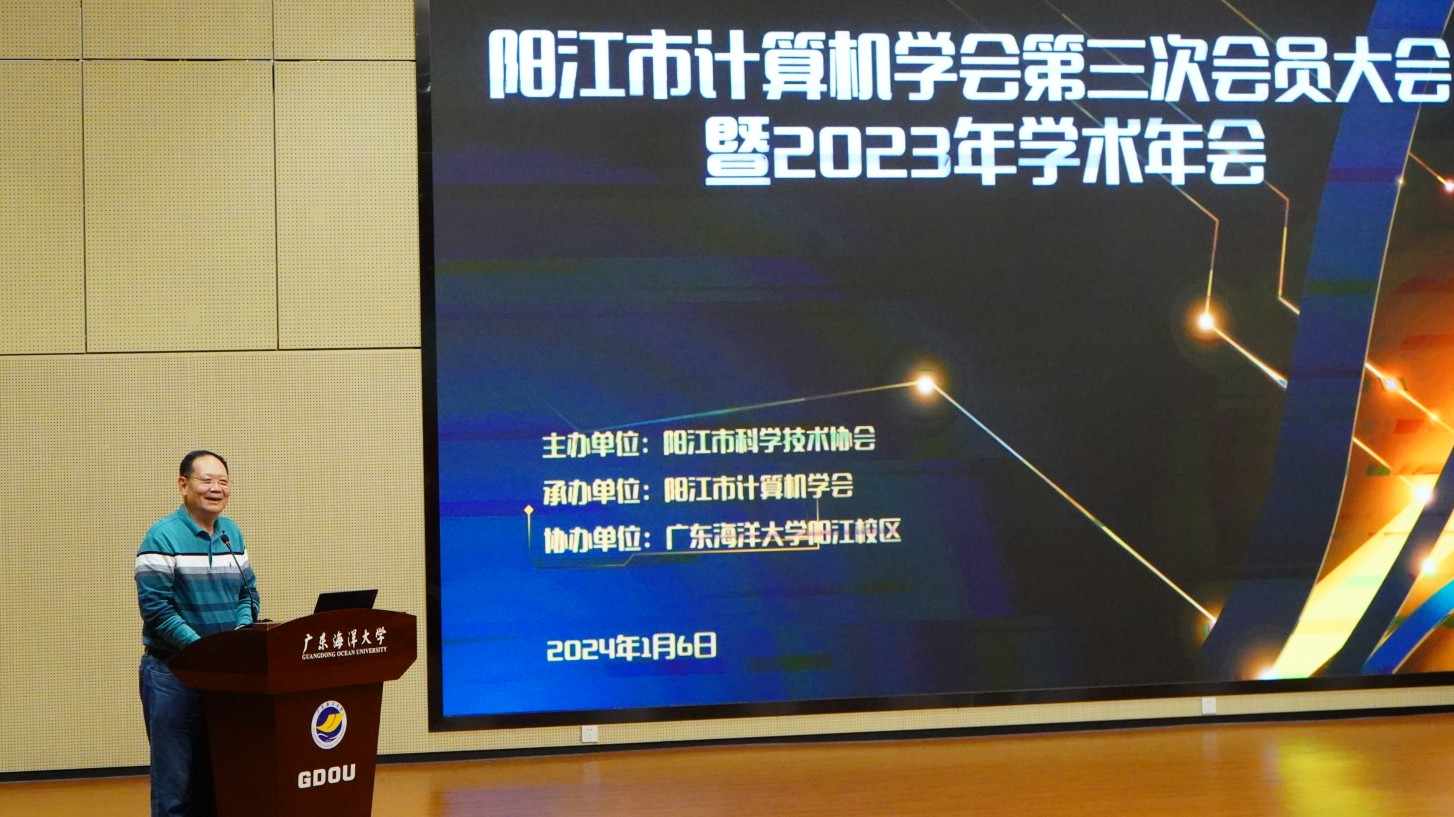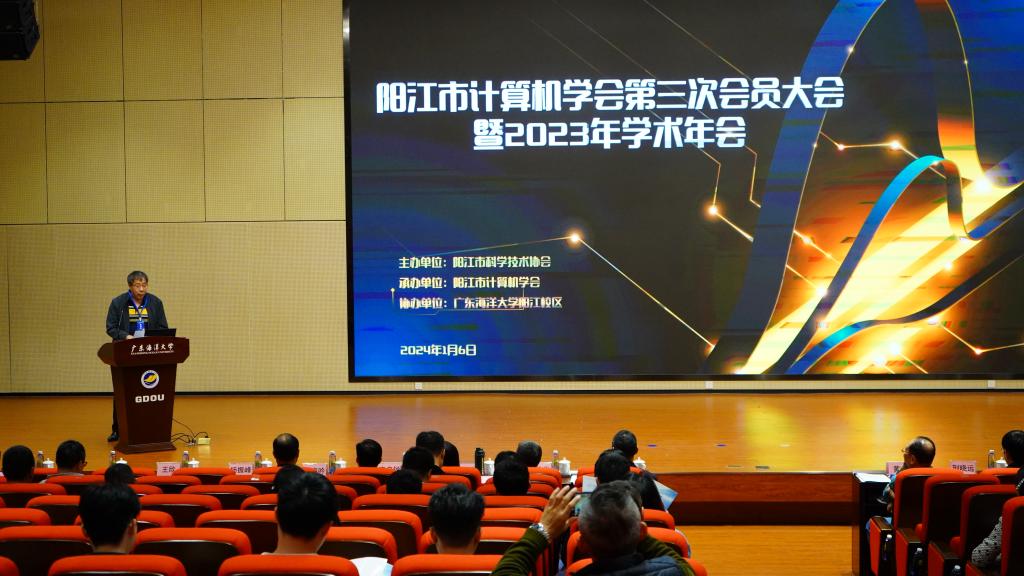 2024年1月6日下午,阳江市计算机学会第三次会员代表大会暨2023年学术年会在广东海洋大学阳江校区海纳楼113报告厅举行。会议由学会秘书长陈震同志主持,出席会议的人员有广东省计算机学会黄轩秘书长、杨惜爱部长,阳江市科协学会部郑旭锁部长、阳江市民政局社会管理科杨振峰科长、阳江市科技局关潘科长、阳江市教师发展中心陈建炜老师、广东海洋大学阳江校区毛琪部长等35位嘉宾,广东海洋大学计算机科学与工程学院吴一民院长、刘利群书记等114位学会会员代表,参加了此次大会。