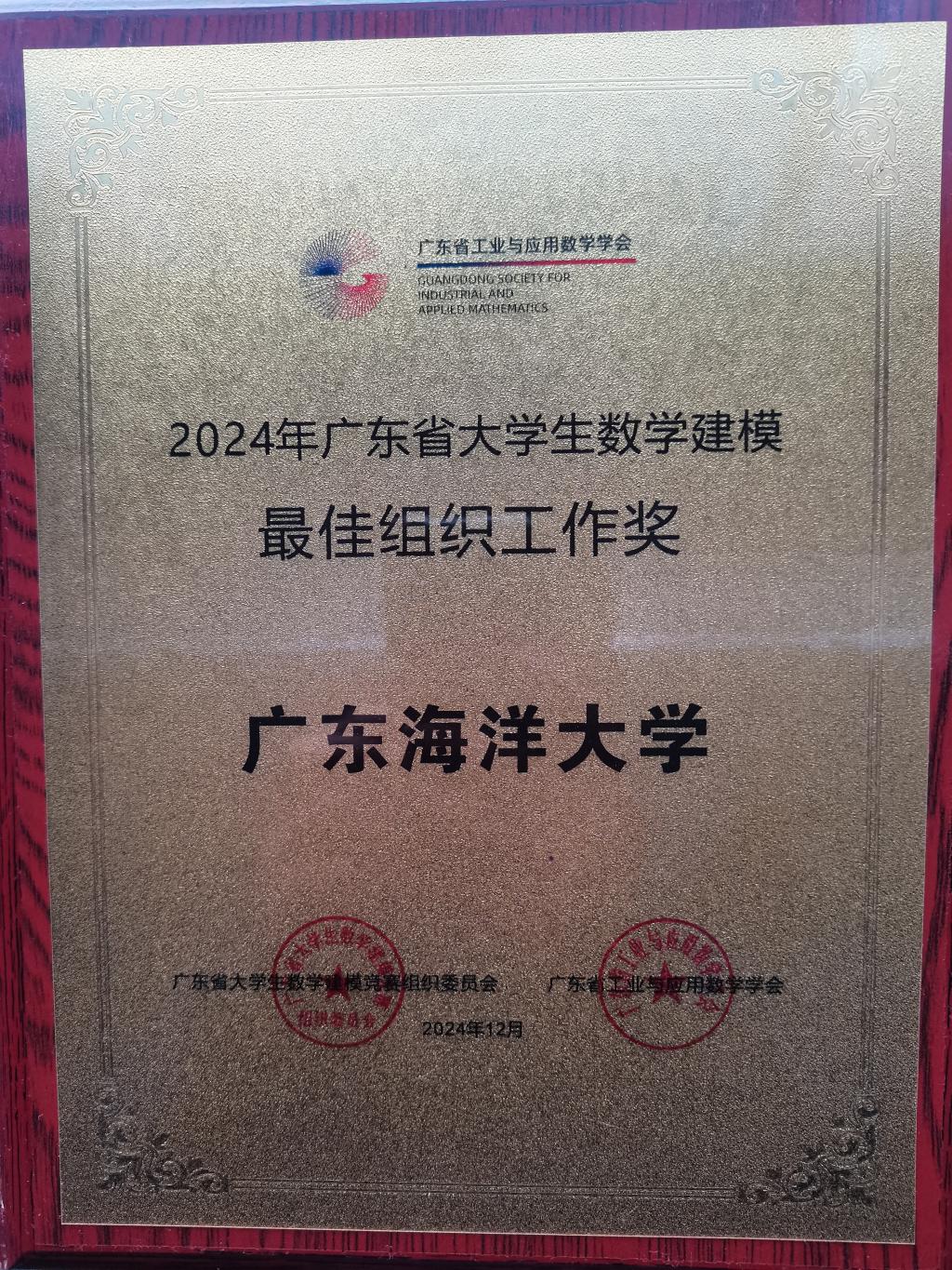 阳江校区学子在2024年全国大学生数学建模竞赛中共获得国家一等奖1项,国家二等奖4项,省级一等奖13项,省级二等奖13项,省级三等奖4项。同时,广东海洋大学还荣获了2024年广东省大学生数学建模“最佳组织工作奖”,用以表彰学校在竞赛的宣传动员、组织协调等方面所付出的辛勤努力和取得的优异成绩。