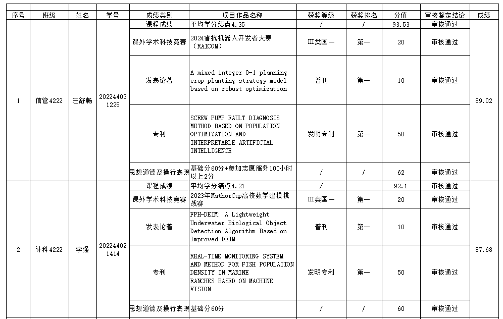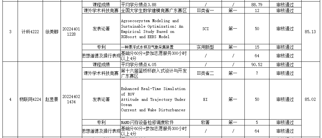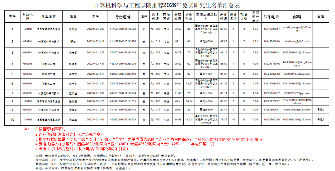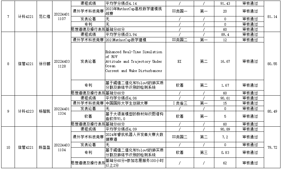 计算机科学与工程学院推免生遴选工作小组根据《广东海洋大学推荐优秀应届本科毕业生免试攻读研究生工作管理办法》(校教务〔2024〕70号)和《计算机科学与工程学院推荐优秀应届本科毕业生免试攻读研究生实施细则》的规定,经学生个人申请、资格审查、学院专家审核小组审核鉴定、学院推免生遴选工作小组综合评定、学院党政联席会议审议通过等程序,确定推荐人选10位同学。
