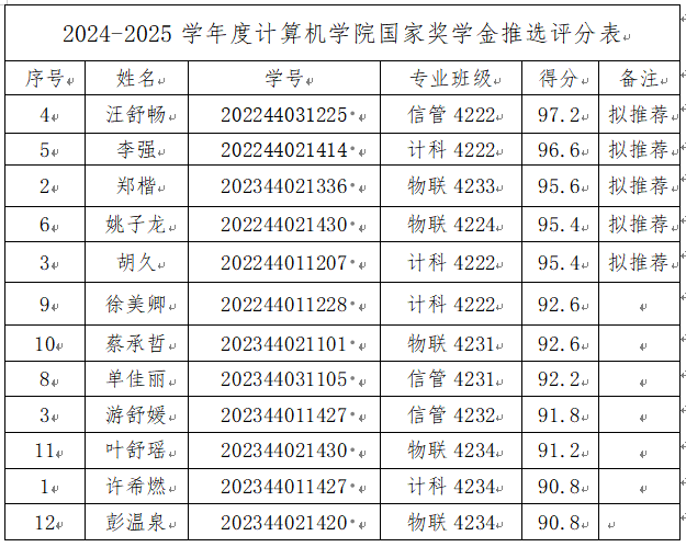 根据《广东海洋大学全日制本科生国家奖助学金实施办法》(校学生[2024]14号)、《计算机科学与工程学院2024-2025学年度国家奖学金评审方案》等文件要求,本着公开、公平、公正的原则,经学生自主申请、学院组织答辩、评审等环节,2024-2025学年度计算机科学与工程学院本科生国家奖学金拟推荐名单公示如下。