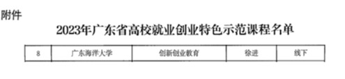 近日,广东省教育厅公布2023年广东省高校就业创业特色示范课程名单的通知,我校徐进老师主持的《创新创业教育》课程获评为广东省高校就业创业特色示范课程。
