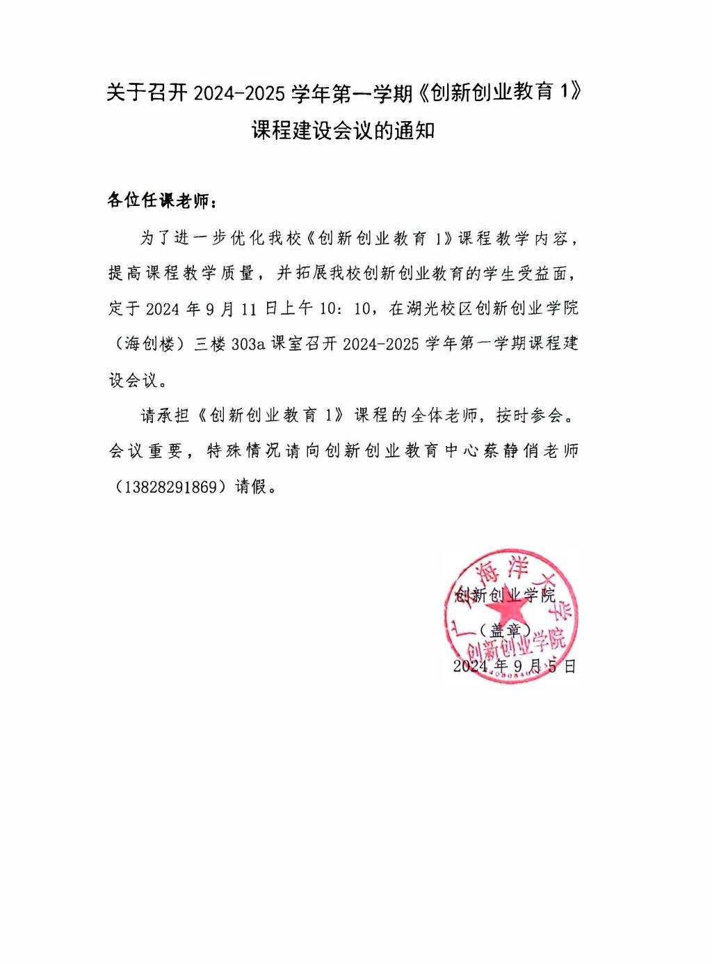 为了进一步优化我校《创新创业教育1》课程教学内容,提高课程教学质量,并拓展我校创新创业教育的学生受益面,定于2024年9月11日上午10:10,在湖光校区创新创业学院(海创楼)三楼303a课室召开2024-2025学年第一学期课程建设会议。请承担《创新创业教育1》课程的全体老师,按时参会。