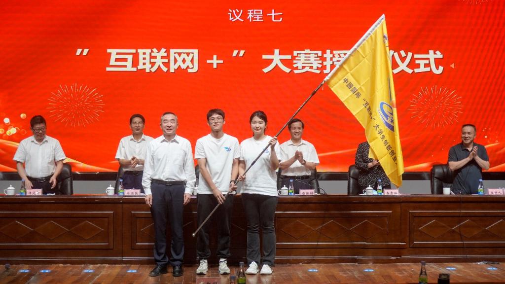 曹俊明为参加第八届“互联网+”大赛省赛的出征团队授旗
