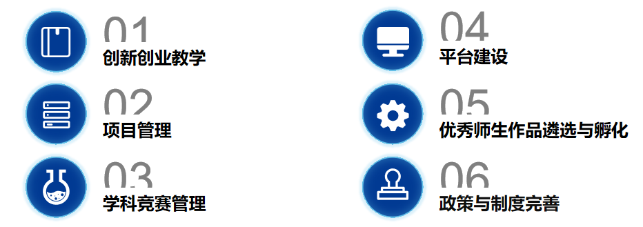 1.设置创新创业类课程教研室。深入探索创新创业教育课程体系建设,开展教学研讨和创新创业教育专题研究,推进创新创业教育课程教学改革。