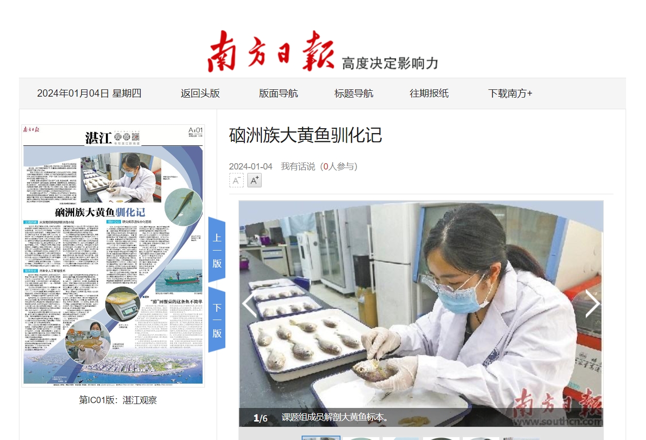 1月4日,南方日报IC01版刊发图文专版报道《硇洲族大黄鱼驯化记》,对我校“硇洲族大黄鱼种质资源及繁育关键技术”课题组开展野生硇洲族大黄鱼全人工繁育技术研究,稳步推进大黄鱼从深海游向百姓餐桌的事迹进行了报道。