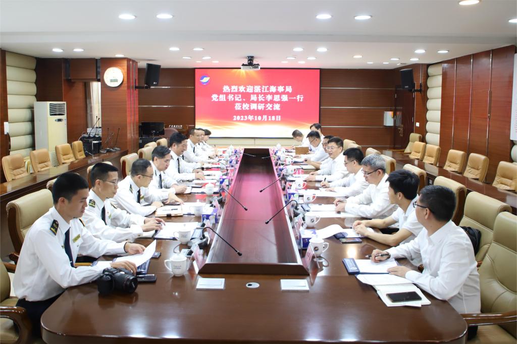10月18日下午,湛江海事局党组书记、局长李思强率队到我校调研交流,双方就强化航海人才培养、助力湛江船员大市建设,深化技术交流合作、服务保障海洋牧场建设,加强资源共享互通、提升干部队伍综合素养等方面进行了座谈交流,学校党委书记杨洲主持座谈会。