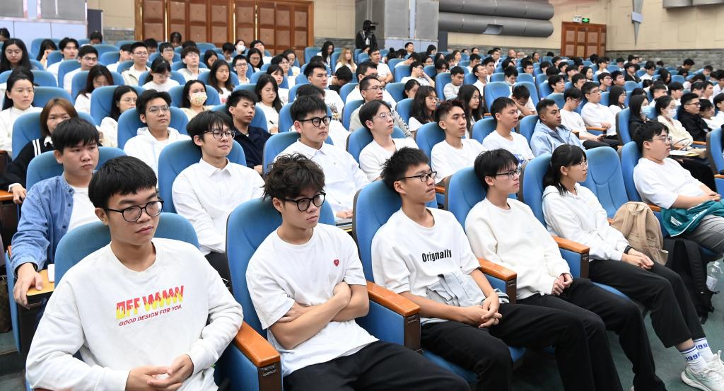 学校广学楼多功能报告厅座无虚席。课堂上,刘红兵结合湛江市情、学习感悟和工作实践,从“沿着总书记视察广东的足迹,学深悟透总书记视察广东重要讲话、重要指示精神”“对标对表总书记的重要要求,走对走实走好湛江现代化建设之路”“牢记总书记的殷殷嘱托,书写无愧时代、无愧青春的多彩人生”三个方面,通过一组组详实的数据、一个个鲜活的案例,对推进中国式现代化的湛江实践进行深入解读。