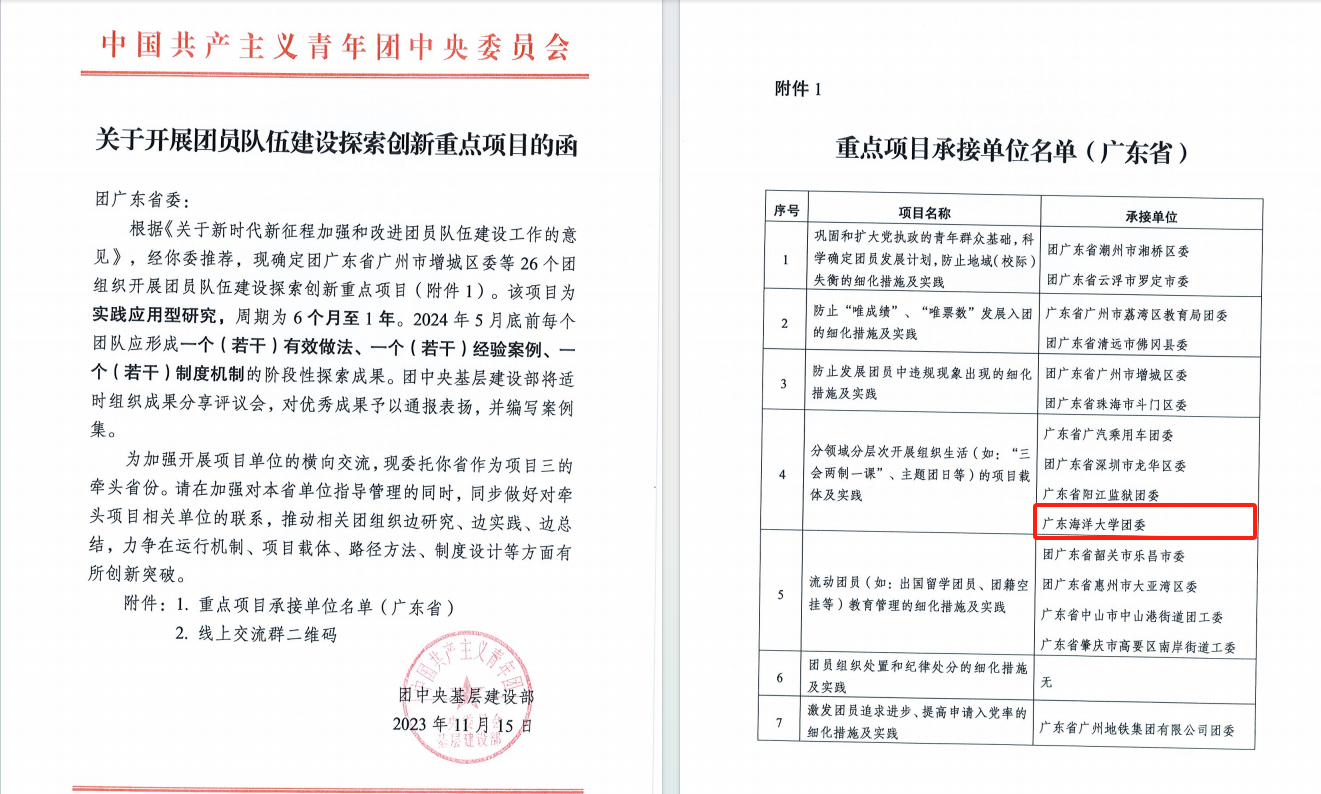 根据团中央下发的《关于新时代新征程加强和改进团员队伍建设工作的意见》文件要求,经团省委选拔推荐、团中央研究确定,我校团委“分领域分层次开展组织生活的项目载体及实践”获批团员队伍建设探索创新重点项目,成为广东省承接团中央重点项目两所本科高校团委之一。该项目是团中央落实团十九大和团十九届二中全会工作部署而提出的重点课题,鼓励全团“揭榜挂帅”、大胆探索。