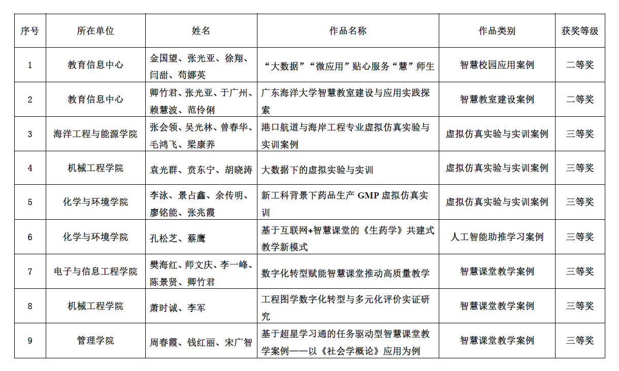 近日,广东省本科高校教育技术指导委员会公布了广东省高校教育数字化转型优秀案例评选结果,我校共获9个项目入选优秀案例,其中,二等奖2个,三等奖7个。获奖案例涵盖智慧校园应用案例、智慧教室建设案例、虚拟仿真实验与实训案例、人工智能助推学习案例、智慧课堂教学案例等类型。