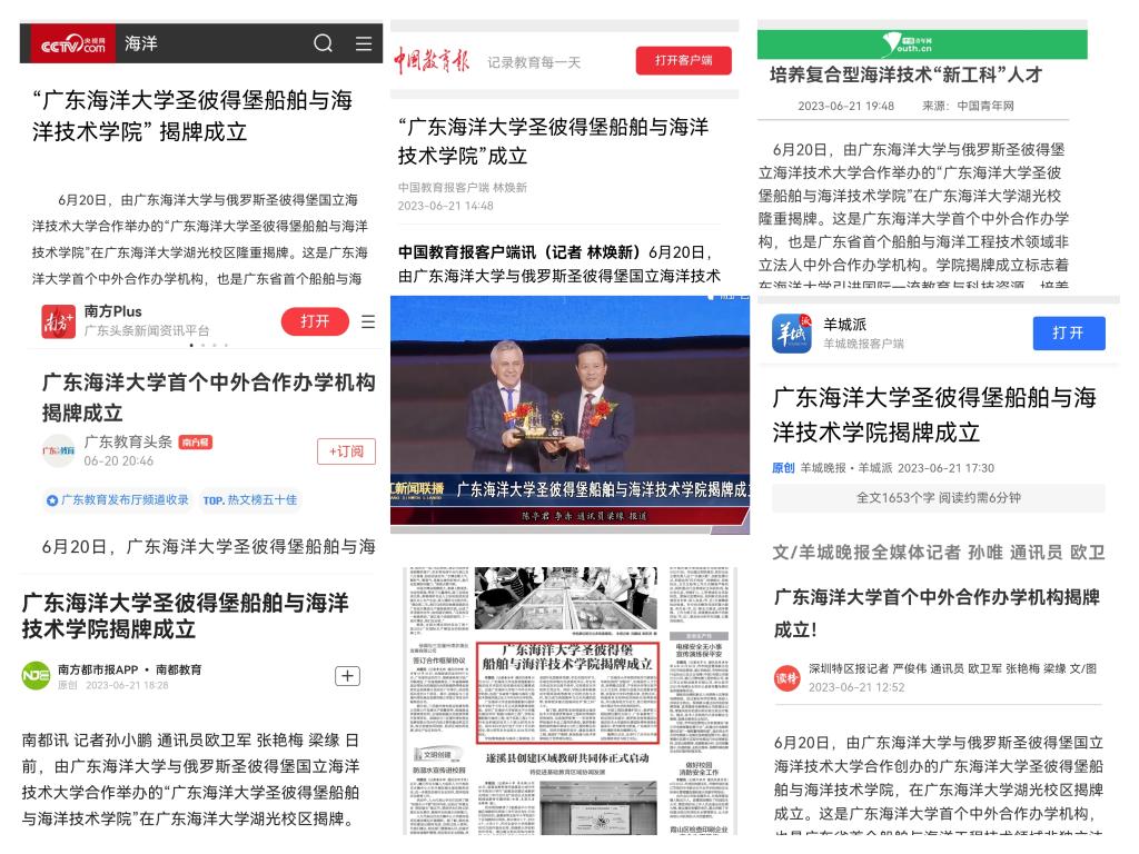 6月20日,广东海洋大学首个中外合作办学机构——广东海洋大学圣彼得堡船舶与海洋技术学院在广东海洋大学湖光校区揭牌。连日来,央视网、中国青年网、中国教育报客户端、中国教育新闻网、南方日报、羊城晚报、南方都市报、深圳特区报、湛江日报、湛江电视台等10余家主流媒体以图文报道或视频等形式聚焦报道了学院揭牌,引发了热烈反响。