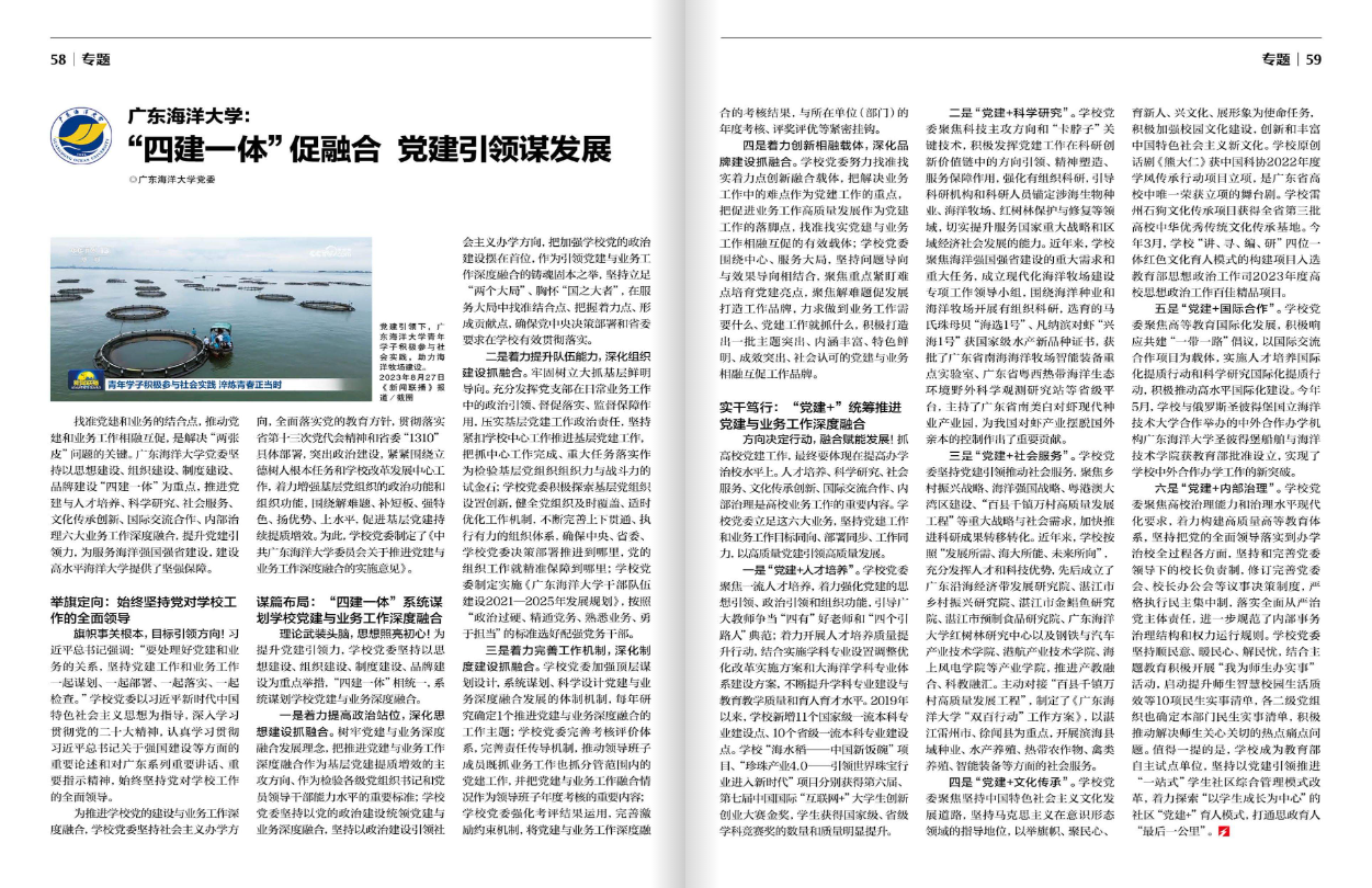 找准党建和业务的结合点,推动党建和业务工作相融互促,是解决“两张皮”问题的关键。广东海洋大学党委坚持以思想建设、组织建设、制度建设、品牌建设“四建一体”为重点,推进党建与人才培养、科学研究、社会服务、文化传承创新、国际交流合作、内部治理六大业务工作深度融合,提升党建引领力,为服务海洋强国强省建设,建设高水平海洋大学提供了坚强保障。