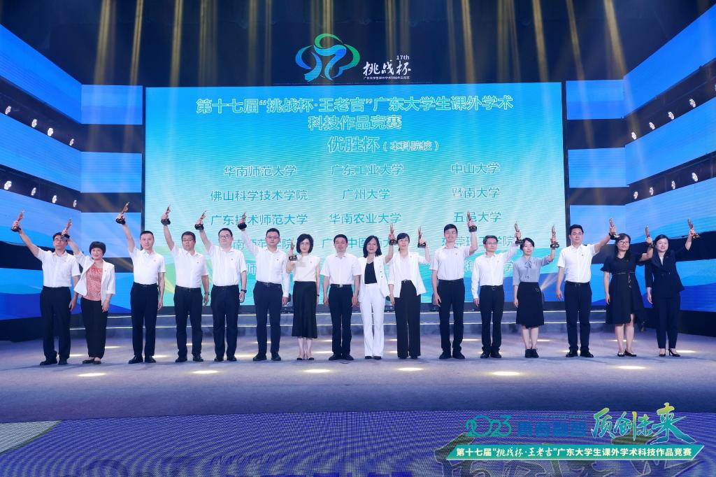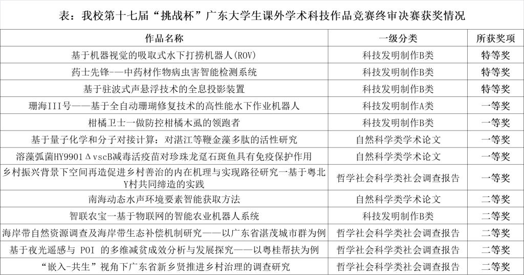 5月27-28日,由团省委、省教育厅、省科技厅等单位共同主办的第十七届“挑战杯”广东大学生课外学术科技作品竞赛终审决赛在中山大学南校区举行。我校在本次“挑战杯”比赛中取得历史性突破,首次捧得广东大学生课外学术科技作品竞赛“优胜杯”(全省15所本科高校获此殊荣)。我校共3项作品荣获特等奖,分别为“基于机器视觉的吸取式水下打捞机器人(ROV)”、“基于驻波式声悬浮技术的全息投影装置”及“药士先锋——中药材作物病虫害智能检测系统”,5项作品荣获一等奖,5项作品荣获二等奖。