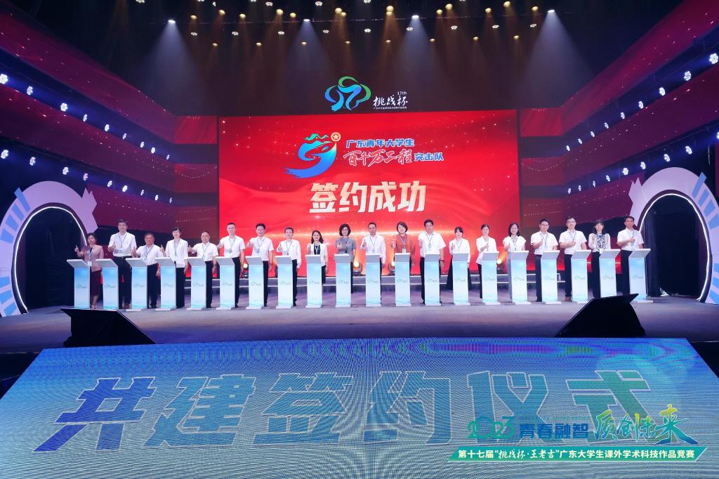 本届“挑战杯”开幕活动上举行了广东青年大学生“百千万工程”突击队行动签约仪式,我校共有7个项目被评为广东青年大学生“百千万工程”突击队行动100个优秀示范项目,是入选广东省“百千万工程”项目最多的高校之一。校团委作为十所高校代表之一与县区领导现场签约,通过“县域+高校”的合作模式,我校更多实践团队、更多优秀项目将与县镇基层进行“一对一”结对,海大学子将奔赴山海、学以致用、“自找苦吃”,向海洋要食物、向土地要产能,将专业知识和青春创意带进田间地头,为广东高质量发展和乡村振兴贡献青春力量。