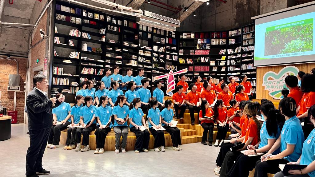 杨洲与青年学子共同学习了习近平总书记视察广东重要讲话、重要指示精神,特别重温了总书记关于生物多样性、红树林生态系统保护的谆谆嘱托。杨洲详细讲述了湛江探寻“红树林之城”生态优先、绿色低碳的高质量发展之路,并展示了广东海洋大学落实省委“1310”部署、助力“绿美广东”建设取得的成果成效。