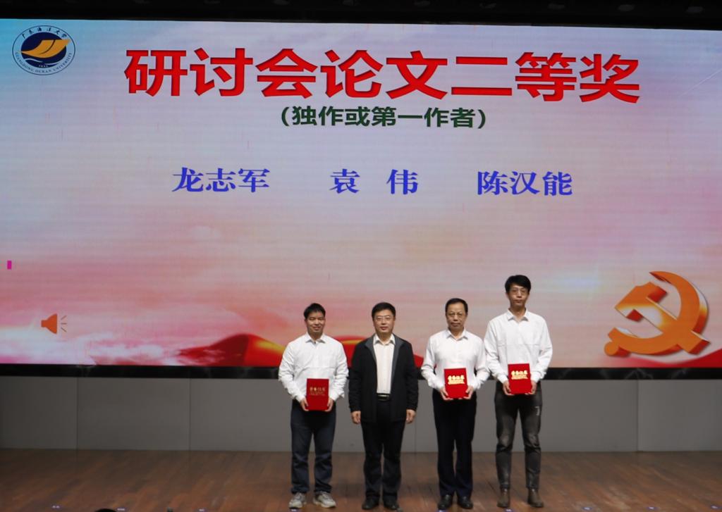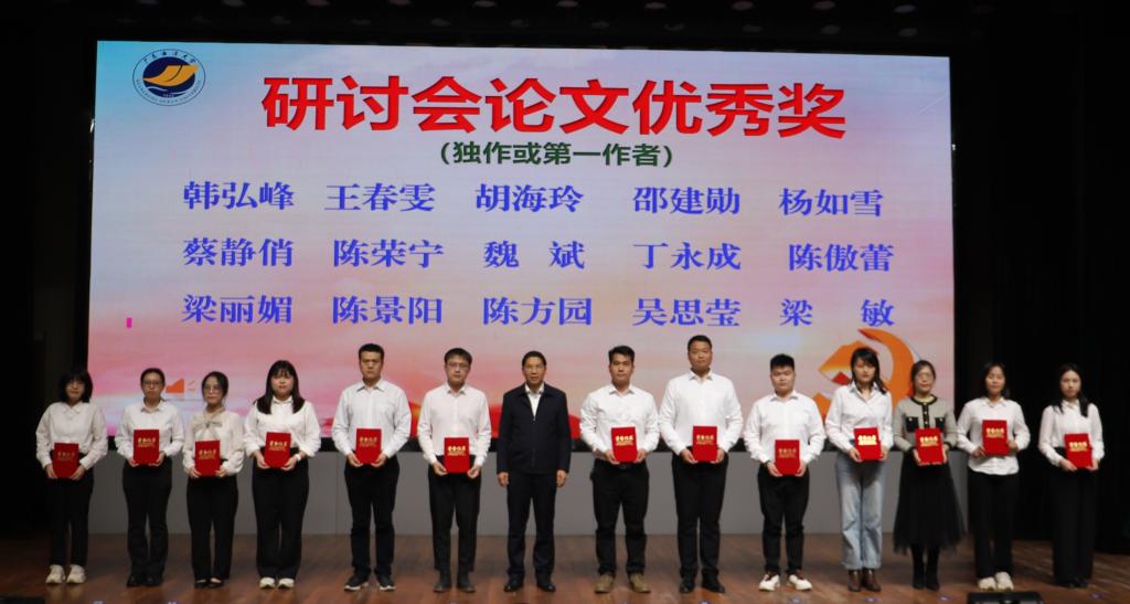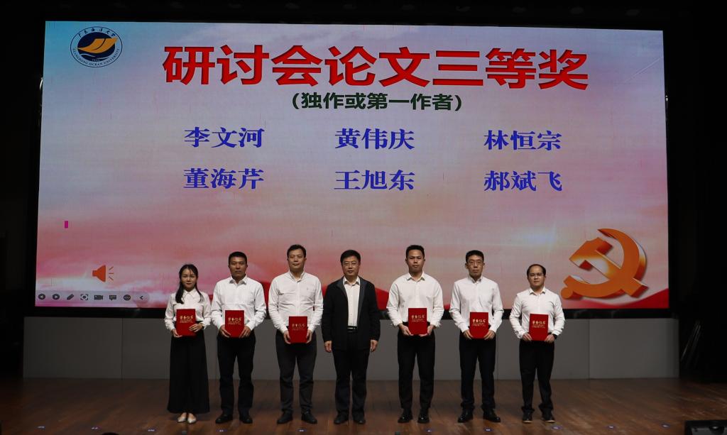 会上,肖文辉宣读了《关于表彰广东海洋大学2023年学生工作理论研讨会优秀论文的决定》。此次学生工作理论研讨会论文征集活动自2023年10月底启动,涉及时代新人铸魂工程、三全育人、“一站式”学生社区、网络思政、就业、心理、社团管理、意识形态安全、网络舆情、学生党建、少数民族学生和留学生教育管理、国家安全教育、学生公寓服务管理等17个参考选题。最终共收到来自全校学工系统教职工投稿论文54篇,经过专家评审,最终共有25篇论文获奖,其中一等奖1篇、二等奖3篇、三等奖6篇、优秀奖15篇。杨洲、林晓敏为获奖者代表颁奖并合影留念。