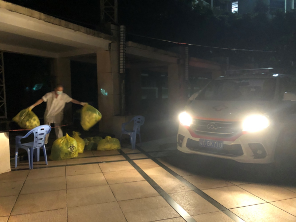 校门诊部有2名救护车司机,谢天泗是其中1名,他是一位年已六旬的退伍军人。由于疫情影响,另一位司机无法到岗上班,这些天每天24小时都是由谢天泗司机在值班,他需要运送急重病人外出就医,送接发热学生与其它九大症状人员外出做核酸检测,要确保24小时随叫随到,没有出车任务也要24小时待命,工作量是平时的两倍。除此之外,谢天泗还主动为加班医务人员、发热隔离学生送饭和回收餐后垃圾,并承担了收集运送核酸检测采样点的医疗垃圾、打扫场地卫生、场地环境消杀等工作。
