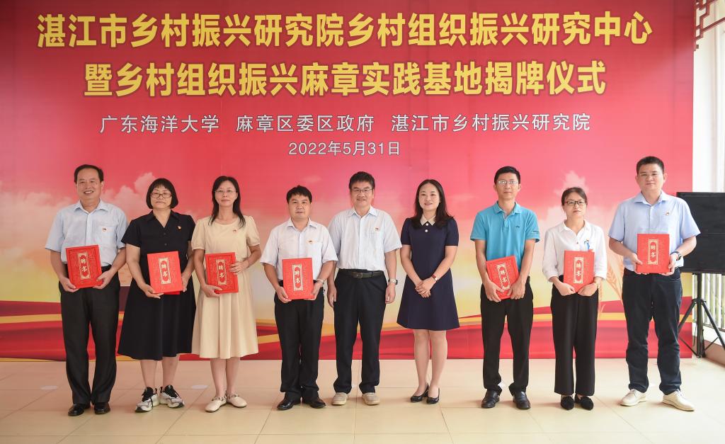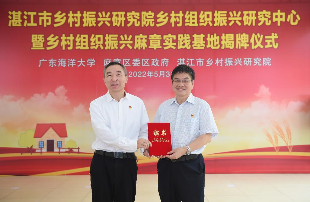 与会领导共同为中心和基地揭牌,并分别为广东海洋大学、市委党校7名乡村振兴有关领域专家代表颁发了聘书,作为乡村组织振兴研究中心和麻章实践基地专家人才库成员。我校马克思主义学院党委书记陈青松受聘担任乡村组织振兴研究中心主任。