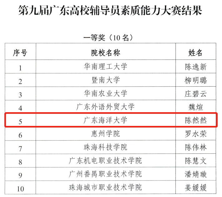 5月下旬,由广东省教育厅主办,高校思想政治工作队伍培训研修中心(华南师范大学)、珠海科技学院共同承办的第九届广东高校辅导员素质能力大赛在珠海科技学院举行。我校管理学院辅导员陈然然经学校遴选推荐,与来自全省143所高校的143名辅导员同场竞技,荣获一等奖(全省10名)。