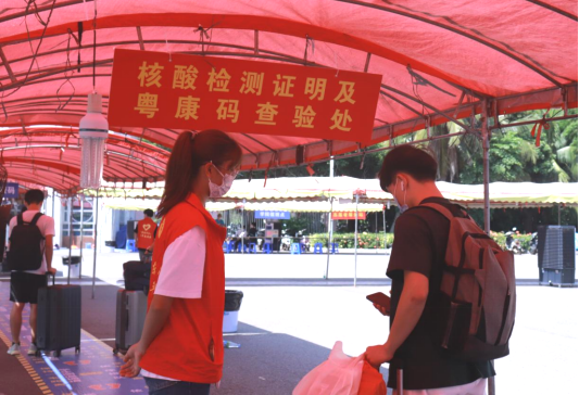 返校期间,秩序井然。各职能部门、各学院辅导员、学生志愿者、医护人员通力合作,全方位全流程地守护返校学生安全和健康。校门前,返校学生在志愿者的引导下出示场所通行码、健康码、行程卡、返校申请审核结果并进行行李消毒、体温检测、人脸识别等流程。现场还设置了核酸检测点和治安报警点,湛江市外的学生到湛后需再次进行核酸检测方可入校。学校车队统筹安排车辆来回学校与车站全天候接送学生到校。保卫人员对报到现场周边的秩序进行维护和交通管制引导。资产经营有限公司对环校车的行车路线进行调整,平衡返校学生接送与校内学生出行。学生公寓门口,返校学生再次进行行李消毒、体温检测、人脸识别,宿舍管理员对学生进行信息核验无误后,学生才能正式进入宿舍。