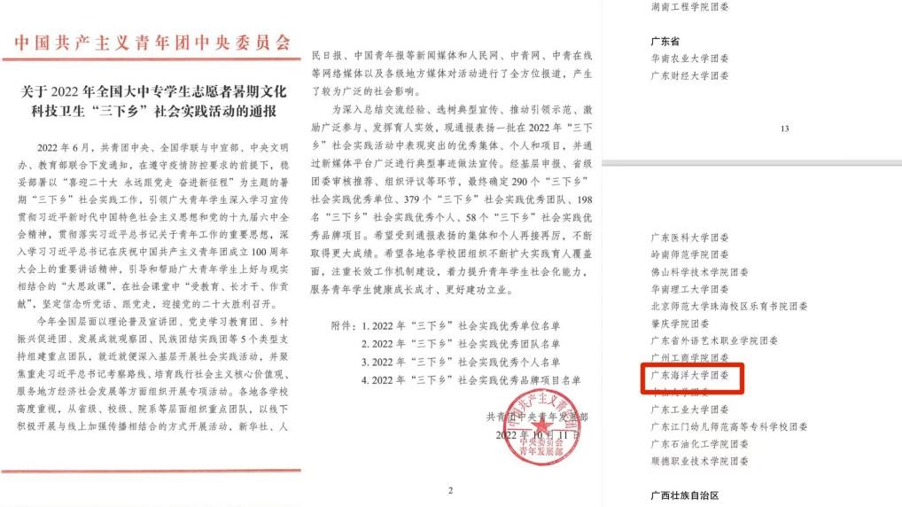 近日,团中央、团省委等上级部门通报了2022年大学生暑期“三下乡”社会实践成果。我校被评为2022年全国大中专学生志愿者暑期“三下乡”社会实践活动优秀单位、2022年广东省大中专学生志愿者暑期“三下乡”社会实践活动优秀单位,2支团队和8名师生荣获广东省大中专学生志愿者暑期“三下乡”社会实践活动优秀团队和优秀个人。