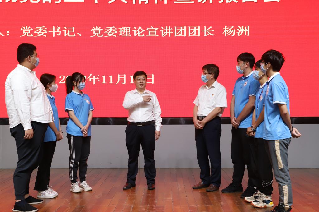 宣讲结束后,杨洲与现场听讲的学生代表进行了互动交流,分享了学习党的二十大精神的心得体会,勉励同学们牢记领袖嘱托,立志做有理想、敢担当、能吃苦、肯奋斗的新时代好青年,切实担负起实现中华民族伟大复兴的时代重任,为全面建设社会主义现代化国家作出贡献。