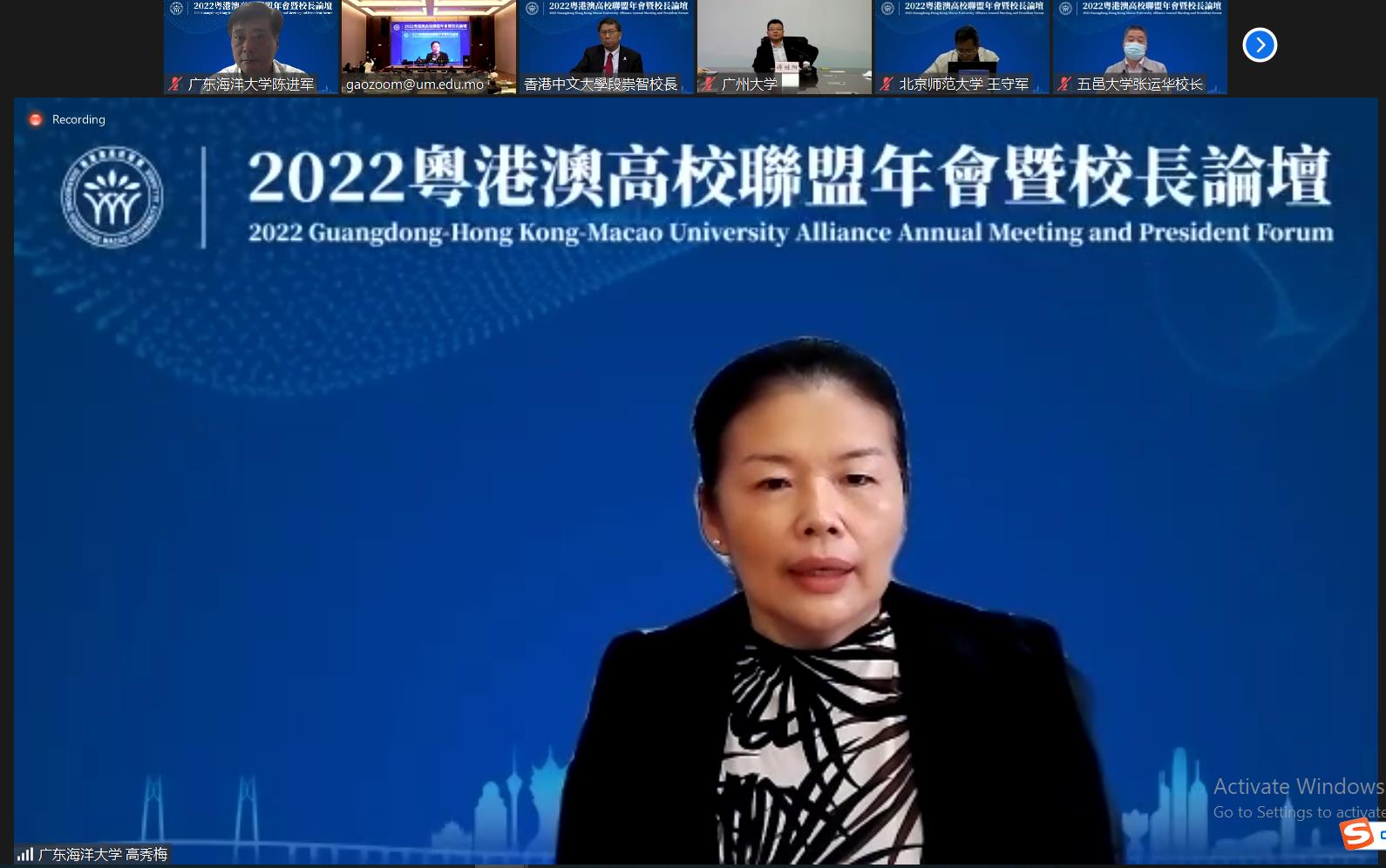 我校副校长高秀梅受委托应邀出席,并以“加强联盟协同效应,推动高水平人才高地建设”为主题发表讲话。她指出,我校作为粤港澳高校联盟首批成员,始终以“海洋强省、海洋强国”战略和《粤港澳大湾区发展规划纲要》为指导,以合作为主线、以人才培养为根本,坚持海洋特色,本着“优势互补、互惠双赢”的原则,积极融入粤港澳大湾区发展,与多所省内、港澳高校开展了校际交流合作,取得了良好业绩。未来,海大愿在人才培养、科学研究等方面与联盟高校进行更深层次的交流与合作,为协同推进粤港澳大湾区高质量发展,为全面建设社会主义现代化国家的使命任务贡献智慧和力量。