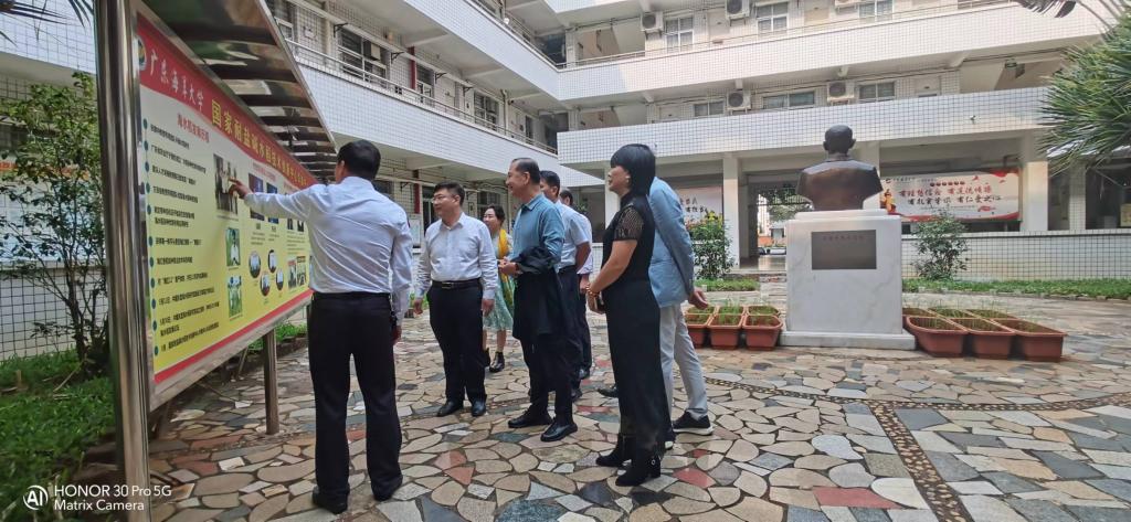 程学斌一行先到湖光校区兴农楼,参观了我校耐盐碱水稻成果展,听取了周鸿凯教授对海水稻发展历程、科研团队、基地建设、取得成果及社会荣誉等情况的介绍。之后,一行来到遂溪县建新镇耐盐碱水稻基地,参观了海水稻种质资源原生境保护圃、海红香米种植试验区和海水稻-禾虫生态高值种养试验区,听取了周鸿凯教授关于海水稻起源、种质杂交利用和新一代“海红香稻”培育,以及“海大红”品牌在惠农益农、助力乡村振兴等方面发挥作用情况汇报。程学斌对相关工作给予了充分肯定,建议进一步加强耐盐碱水稻基地的规划与建设,加强种质资源保护与创新。