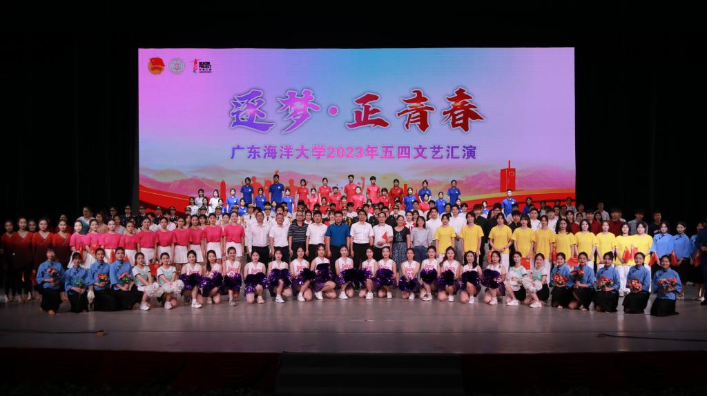 表彰结束后,现场进行“逐梦·正青春”五四文艺汇演。表演由奋斗的青春、奔跑的青春和中国正青春三个篇章组成,整台演出精彩纷呈、气势非凡。开场节目《青春,启航》铿锵有力、感情真挚,生动展示了中国青年在新时代新征程上锐意进取、踔厉奋发的青春形象。歌伴舞《少年中国说》、舞蹈《声生不息》、独唱《星辰大海》等节目展示了我校青年学子立志成为有理想、敢担当、能吃苦、肯奋斗的新时代好青年。古筝演奏《清明上河图》、独唱《在希望的田野上》、歌伴舞《奔跑的青春》、舞蹈《舞动青春》等节目,表现了当代大学生敢于有梦、勇于追梦、勤于圆梦的决心。舞蹈《我们都是追梦人》催人奋进,女子花样操枪表演《飒爽芳华》矫健轻盈,啦啦操《我的未来式》活力四射,共同描绘了“青春如画如诗,奋斗创造不凡”的青春画卷。朗诵与歌舞作品《不忘初心》唱响了海大青年不负时代、不负年华的青春誓言,将整场演出气氛推向高潮。