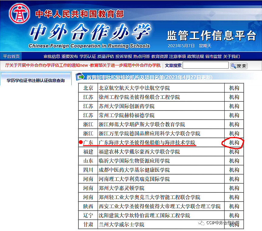 日前,教育部对2022年下半年各地上报的中外合作办学机构和项目进行了评审,依照专家评议结果,批准共计16个本科以上中外合作办学机构和25个本科以上中外合作办学项目。我校与俄罗斯圣彼得堡国立海洋技术大学合作举办的中外合作办学机构“广东海洋大学圣彼得堡船舶与海洋技术学院”(许可证编号:MOE44RUA02DNR20232314N)名列其中。这是我校获批的首个中外合作办学机构,实现了我校中外合作办学工作的新突破。