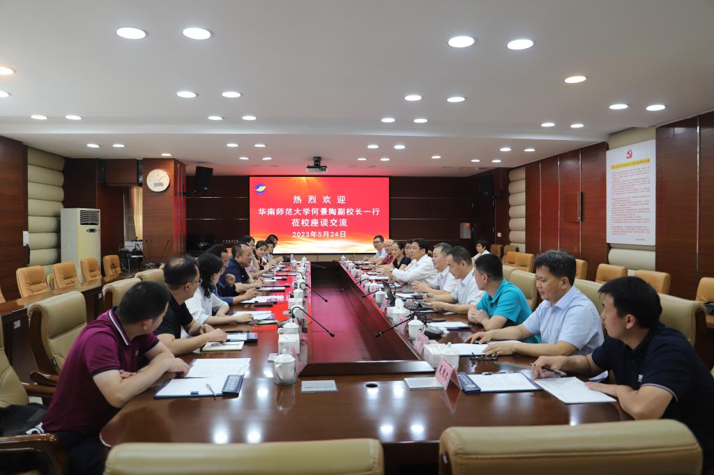 座谈会上,林晓敏和何景陶分别简要介绍了两校的基本情况。林晓敏对何景陶一行的到来表示热烈欢迎。他表示,华南师范大学是一所教师教育特色鲜明、学科门类齐全的高水平综合性师范大学,是中国培育教育人才的南方高地,是“双一流”高校,在人才培养、科学研究、社会服务、文化传承创新、国际交流与合作等多方面办学成就显著,尤其在学生工作、创新创业、综合治理等方面是我们学习的榜样,是我们学习的标兵。希望通过此次交流,积极学习华南师范大学相关的先进经验与做法,开阔工作思路,推动我校学生工作、创新创业、学生安全稳定等方面高质量发展。