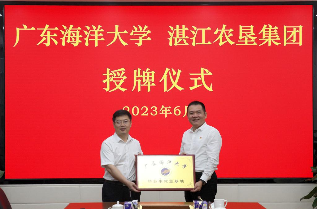 会后,杨洲向湛江农垦集团有限公司(农垦局)授予“广东海洋大学毕业生就业基地”牌匾。