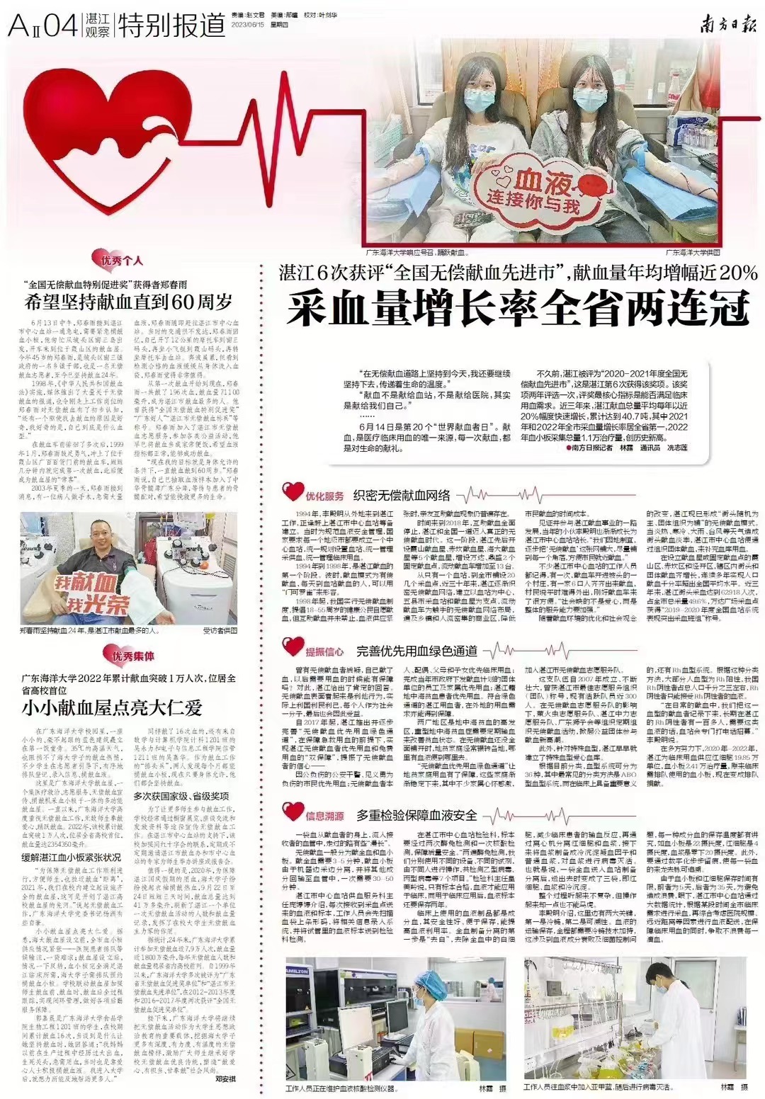 6月15日,南方日报IC04版刊登报道《小小献血屋点亮大仁爱》,对我校一直以来把无偿献血活动作为大学生思想政治教育的重要载体,海大师生奉献爱心、踊跃献血的先进事迹作了报道。学校党委书记杨洲接受了南方日报采访,表示将继续挖掘海大学子更多有深度、有力度、有温度的无偿献血榜样,激励广大师生继承好学校无偿献血优良传统,塑造“献爱心、有担当、甘奉献”社会风尚。