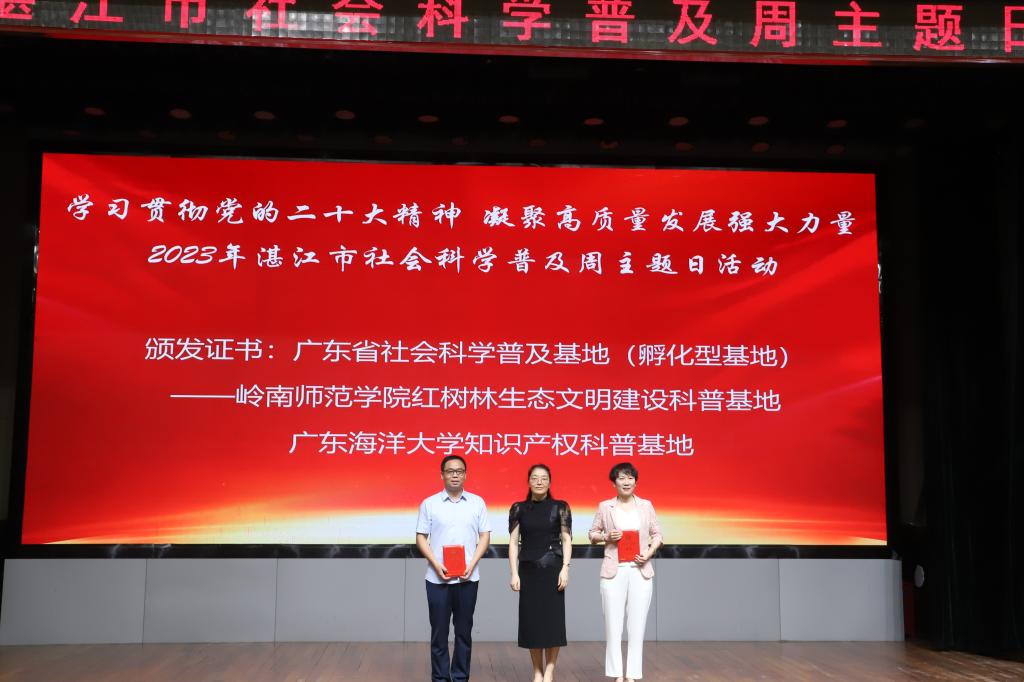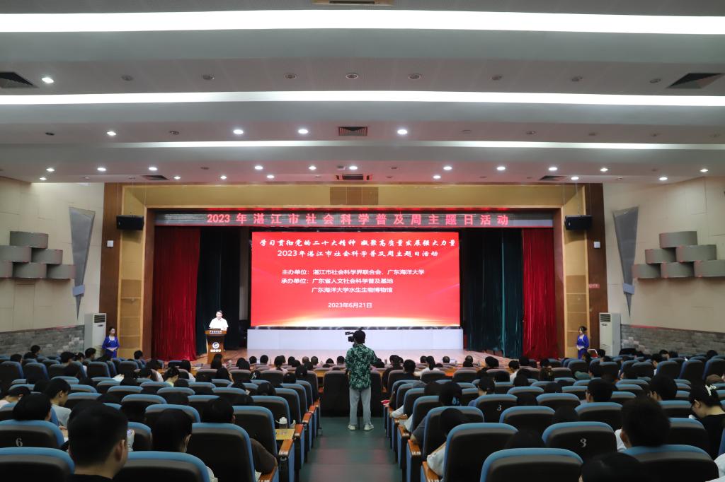 6月21日,由湛江市社会科学界联合会、广东海洋大学主办,广东海洋大学水生生物博物馆、广东省人文社会科学普及基地承办的“学习贯彻党的二十大精神,凝聚高质量发展强大力量”2023年湛江市社会科学普及周主题日活动在我校举行。现场活动内容丰富,包括启动仪式、省级社科普及基地授牌、颁发基地证书、主题展览、党的二十大主题专家讲座等。我校副校长高秀梅教授、湛江市委宣传部副部长周敏飞,湛江市社会科学界联合会党组书记、主席刘喜等领导嘉宾受邀出席本次活动。校长办、宣传部、科技处等相关职能部门领导、湛江市社科联全体干部、市社科组织负责人、科普基地代表等参加活动。校长办主任尹喜主持活动。