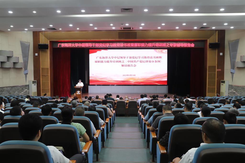 为了深入推动学校党纪学习教育走深走实,从严从实抓好党的纪律建设,筑牢党员领导干部的廉洁自律意识,根据学校工作安排,6月14日上午,学校在广学楼多功能厅举行党纪学习教育读书班学习会,专题学习《中国共产党纪律处分条例》,会议邀请湛江市纪委监委审理室副主任缪怡然作专题辅导报告。学校全体副处级(含相当)以上干部、机关全体党员参加会议,会议由学校纪委副书记、纪检监察室主任肖文辉主持。