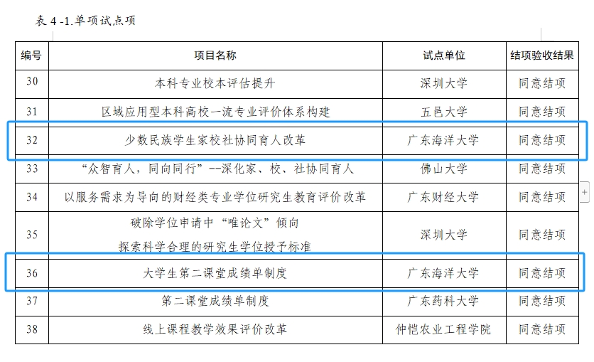 近日,中共广东省委教育工作领导小组办公室公布了广东省教育评价改革试点项目的结项验收结果。我校的1个综合试点项目(广东海洋大学教育评价改革试点高校项目)及2个单项试点项目(大学生第二课堂成绩单制度试点项目、少数民族学生家校协同育人改革项目)共3个项目全部通过结项验收。
