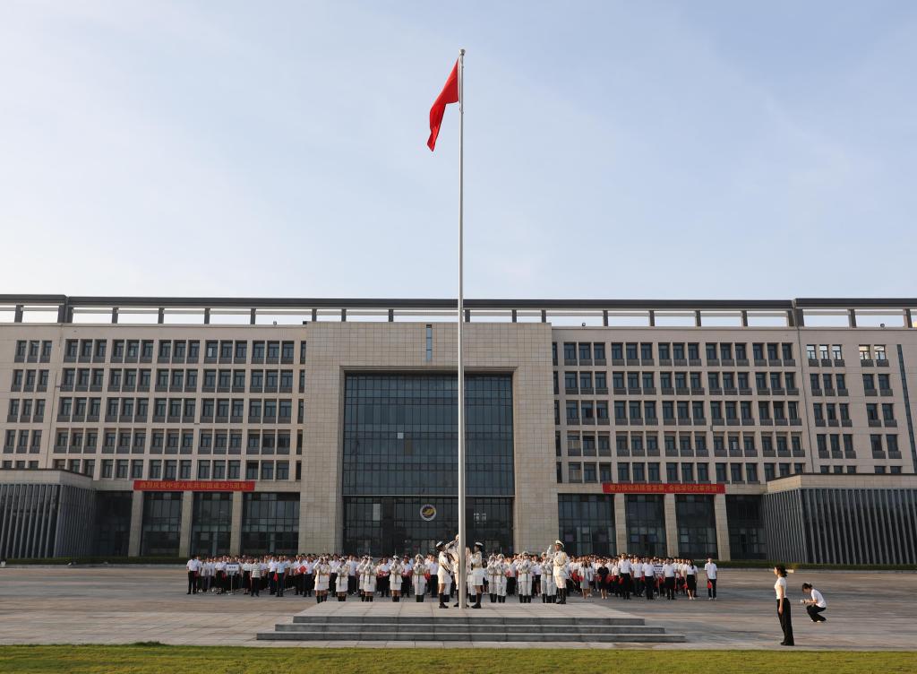 迎着初升的朝阳,国旗护卫队员们精神抖擞,迈着整齐划一、铿锵有力的步伐,护送国旗至升旗台。国歌奏响,鲜艳的五星红旗伴随雄壮的《义勇军进行曲》冉冉升起,在全体师生的注目下迎风飘扬。