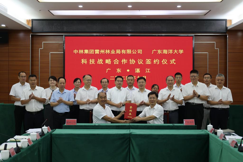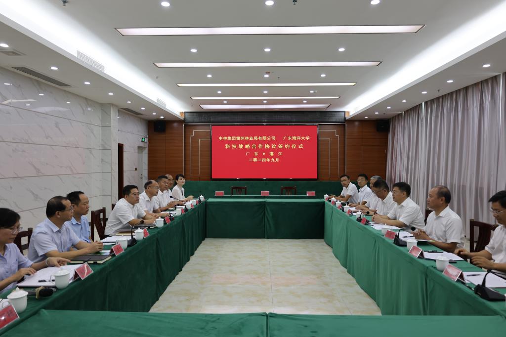 杨洲在座谈会上表示,希望双方在党建共建引领下,开展有组织科研攻关、有组织人才培养、有组织社会服务。张立丰代表雷林公司对杨洲一行表示热烈欢迎,并介绍了中林集团及雷林公司的企业概况。邓逢光介绍了我校近年来的发展建设情况。我校滨海农业学院院长马驿和雷林公司林业科学研究分公司经理陈文平分别代表双方签署了《广东海洋大学与中林集团雷州林业局有限公司科技战略合作协议》。随后,双方围绕党建共建、人才培养、科研攻关、平台建设、社会服务进行了深入交流。
