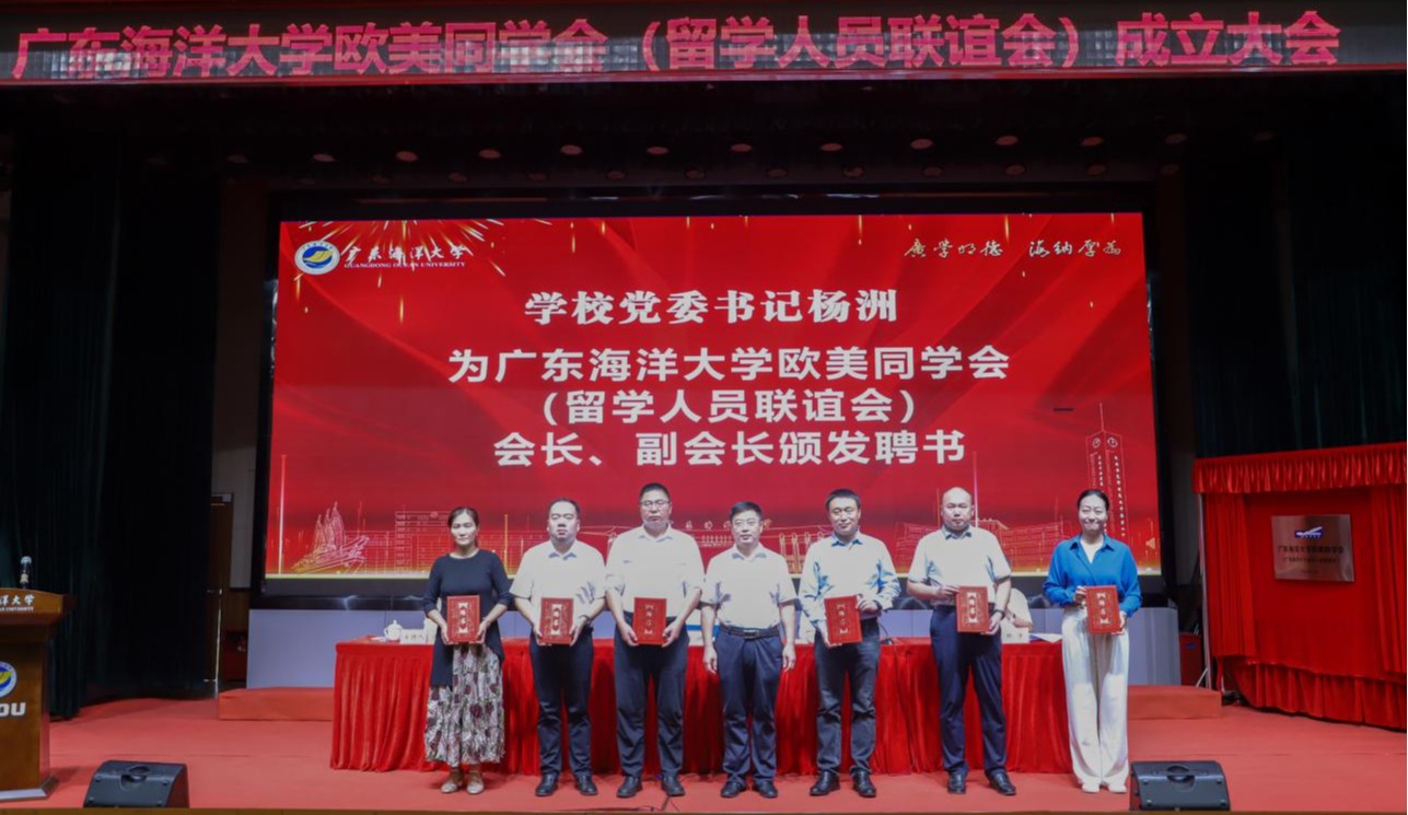 大会现场,与会领导嘉宾共同为广东海洋大学欧美同学会(广东海洋大学留学人员联谊会)揭牌。杨洲为学校欧美同学会新任理事会会长、副会长颁发聘书。