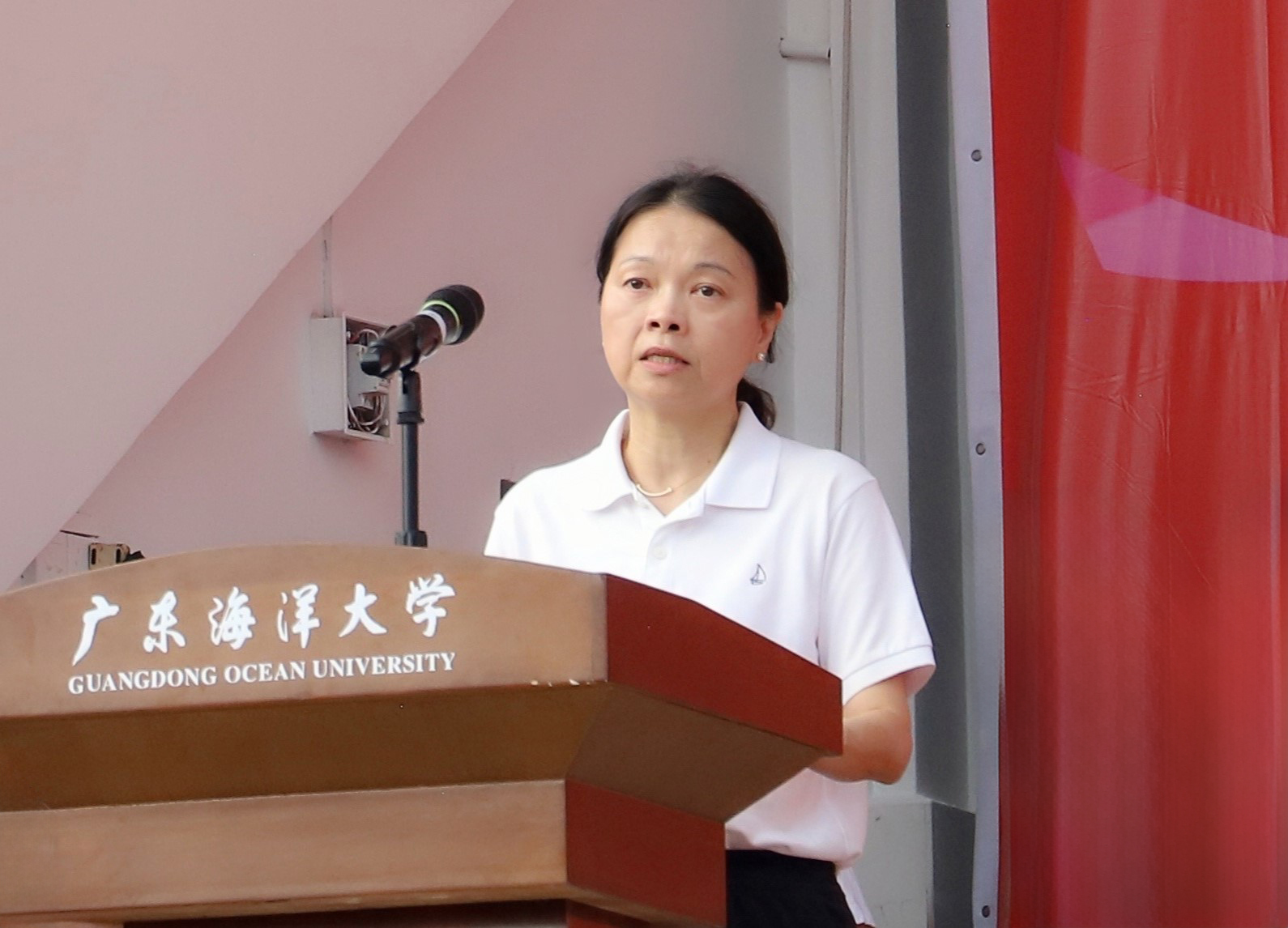 谭平致开幕词。她代表学校向本届田径运动会的成功举办表示热烈祝贺,向辛勤训练、积极准备的师生员工们致以诚挚问候与美好祝福,向为运动会各项筹备工作倾注心血的工作人员表达深切谢意。谭平指出,学校积极响应党中央号召,强化体育育人,传承海大体育优良传统,组织了一系列丰富多彩的体育健身活动。师生在体育竞技中屡获佳绩,如女子篮球队夺得CUBA二级联赛广东赛区冠军,武术代表队在全国锦标赛中斩获两冠,展现了海大人的坚韧拼搏精神。谭平强调,体育事业的高质量发展是学校高质量发展的重要组成部分。希望全体师生围绕新时代高质量发展“1918”工作安排,用中华体育精神凝聚力量,将运动激情转化为干事创业热情,助力高水平海洋大学建设。谭平号召大家积极投身于全民体育中,努力养成良好且科学的体育锻炼习惯,并衷心祝愿每位运动员都能赛出风格、赛出水平、赛出友谊,共同谱写海大新篇章。